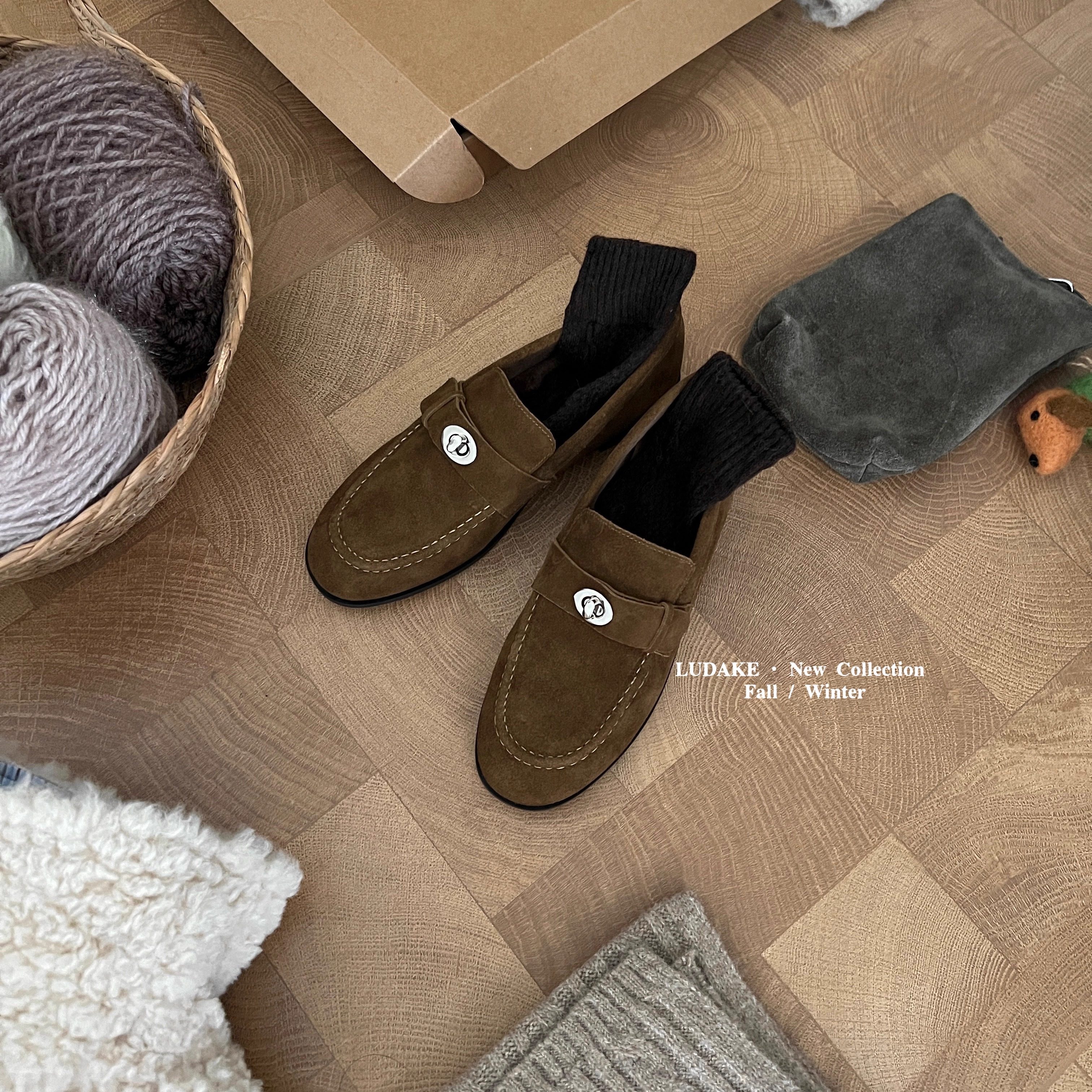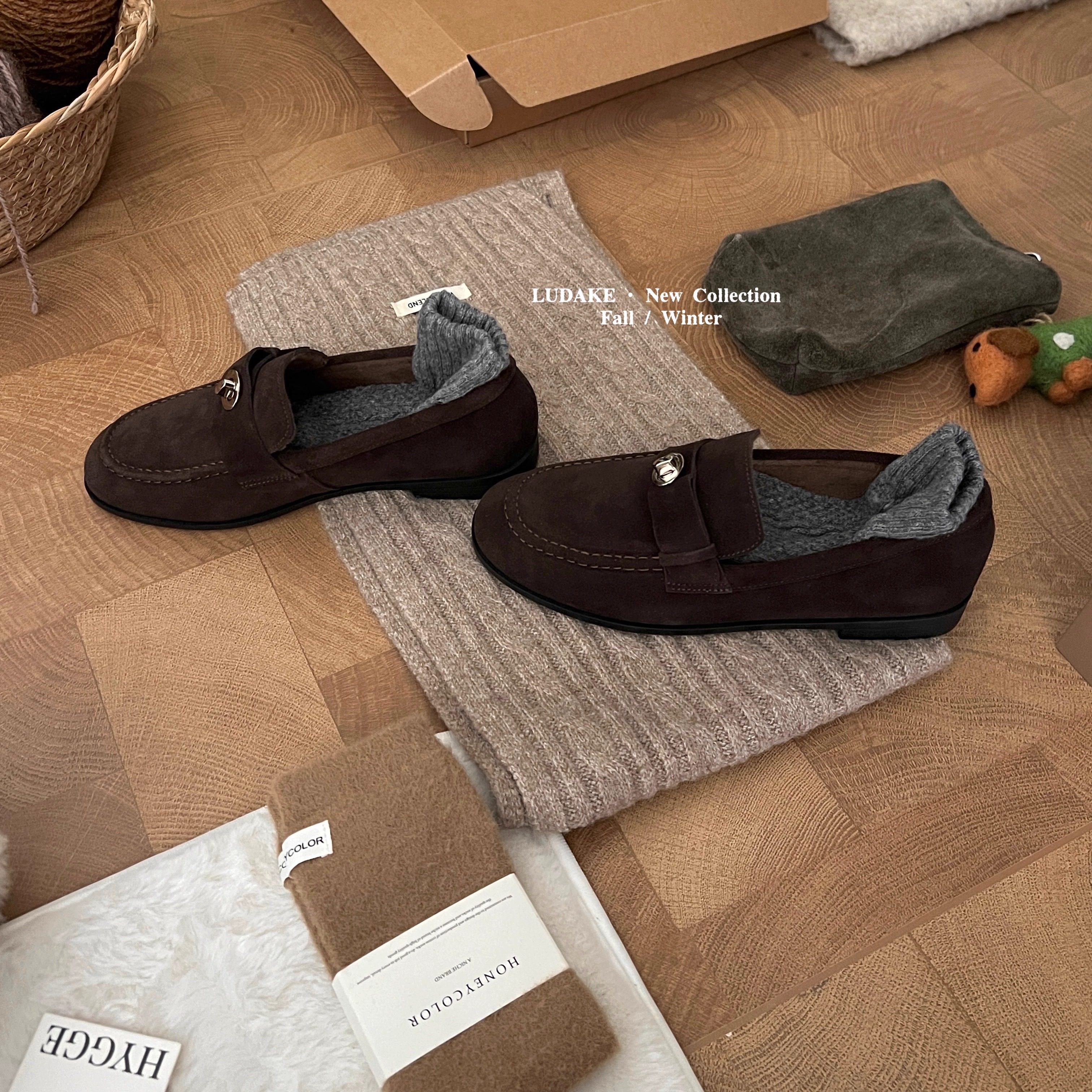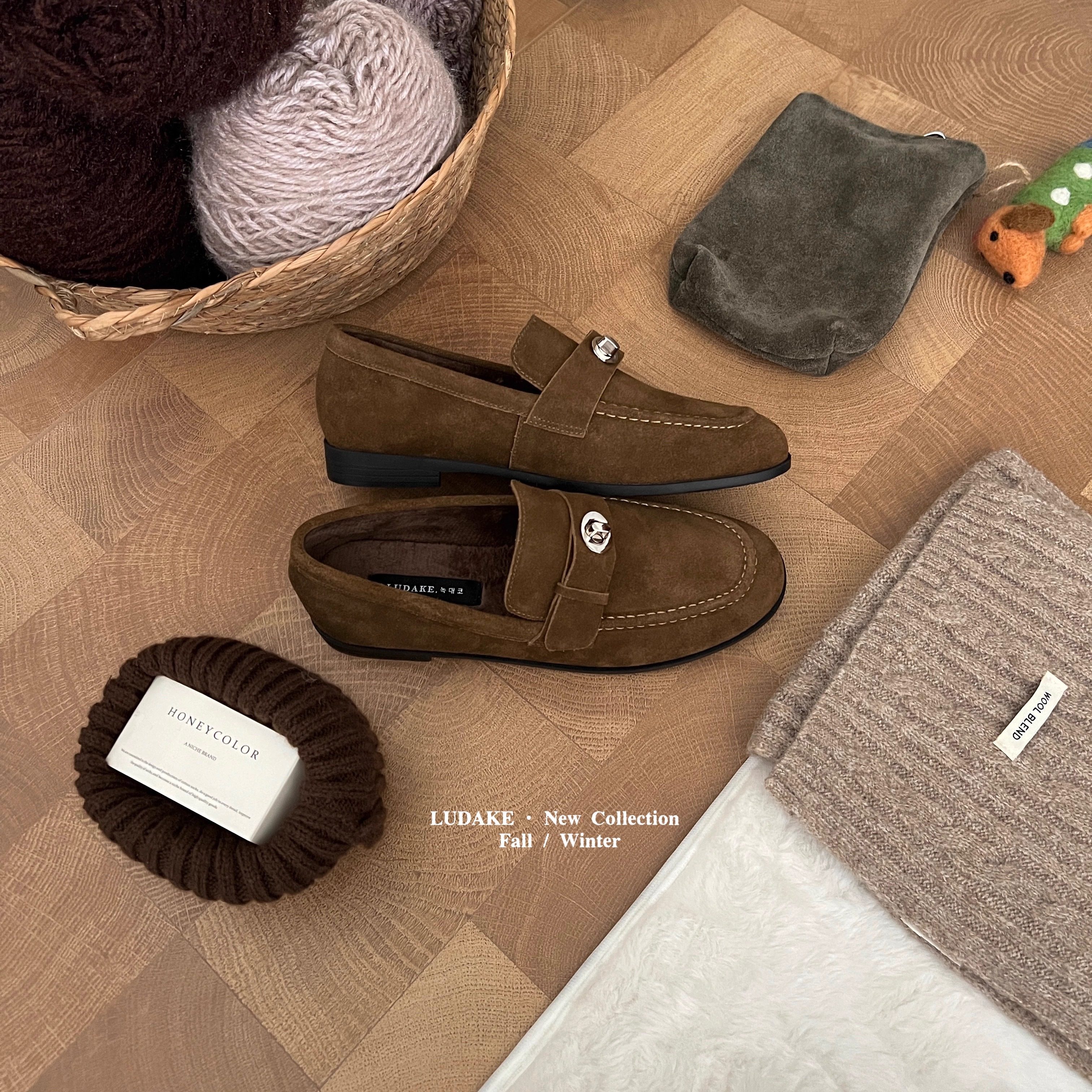 MUMU英伦风磨砂真皮乐福鞋女一脚蹬金属扣加绒平底单鞋舒适小皮鞋