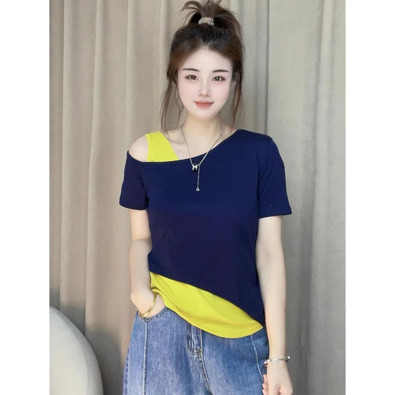 特大码300斤纯棉吊带露肩短袖t恤女夏季设计感小众拼接体恤上衣潮