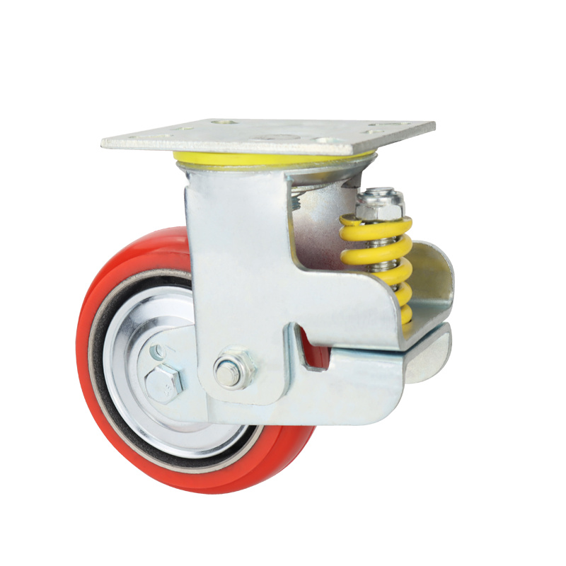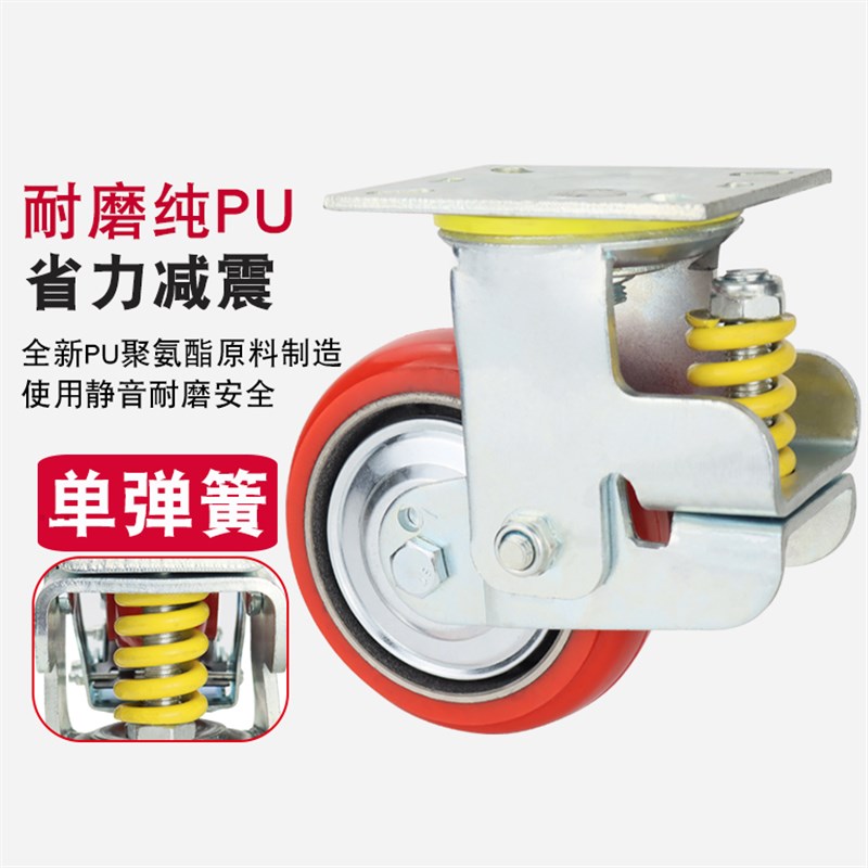 弹簧减震脚轮4寸5寸6寸8寸铁芯PU轮红色聚氨酯万向轮避震牵引轮子