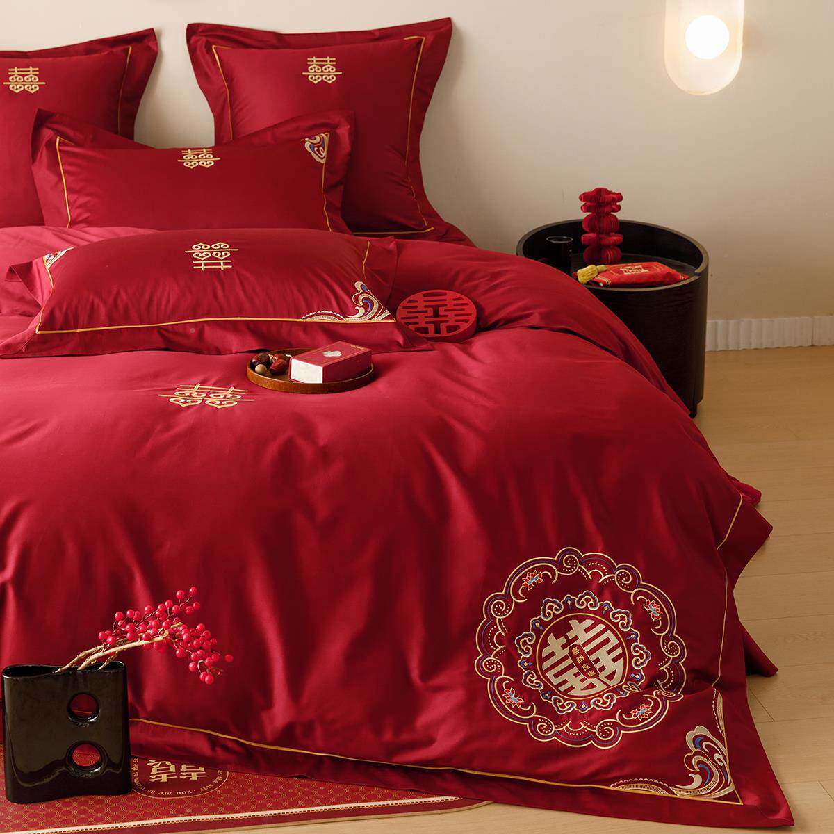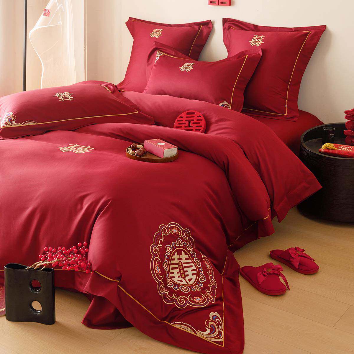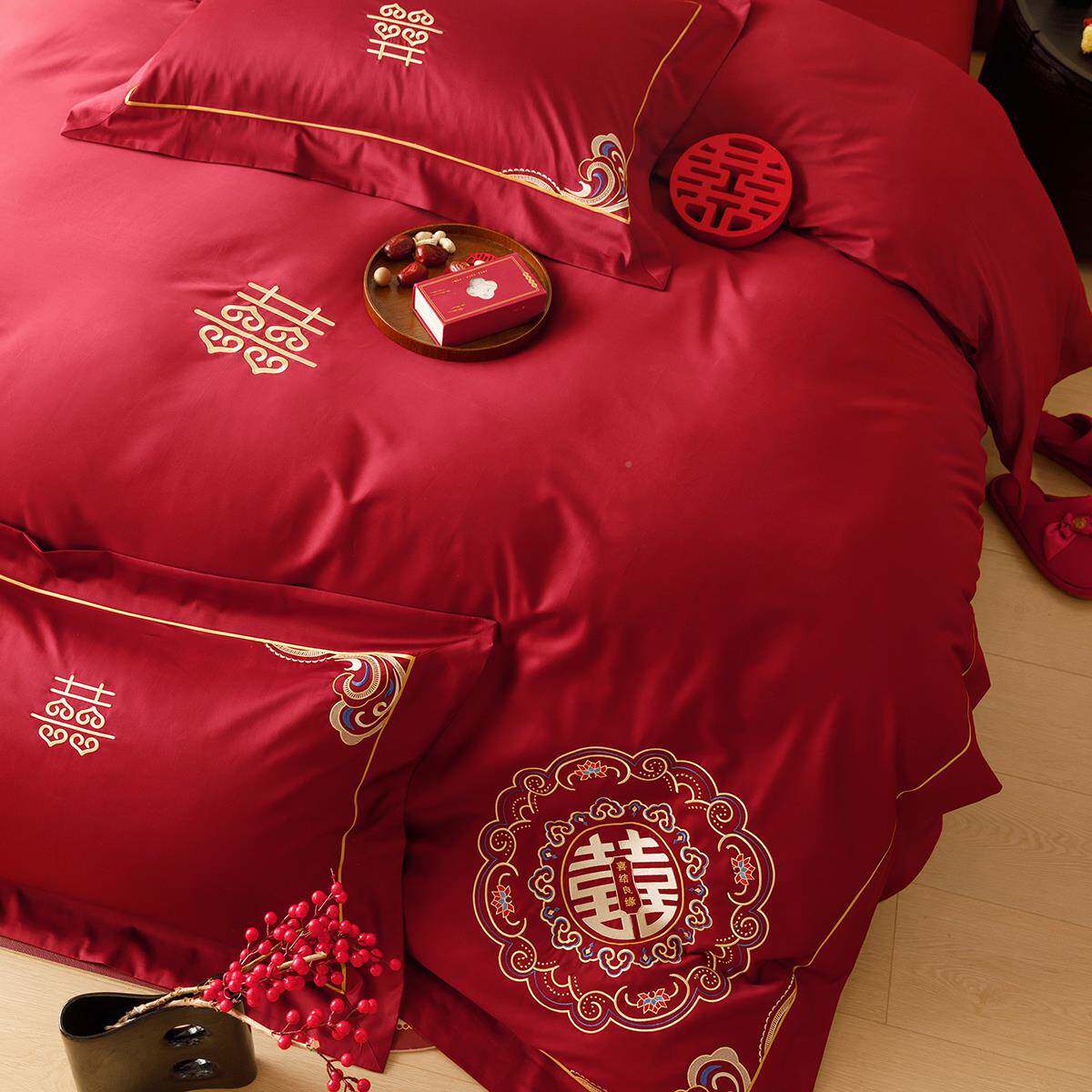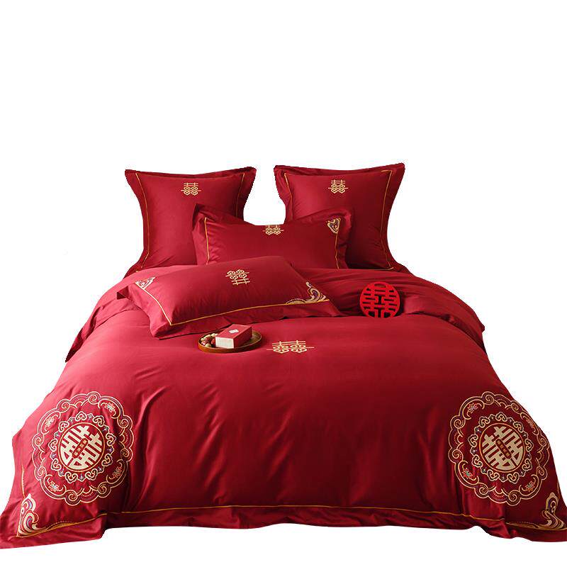 中式aba婚庆喜字刺绣20支绒棉四件结套婚陪嫁红色长床单1.8床1上
