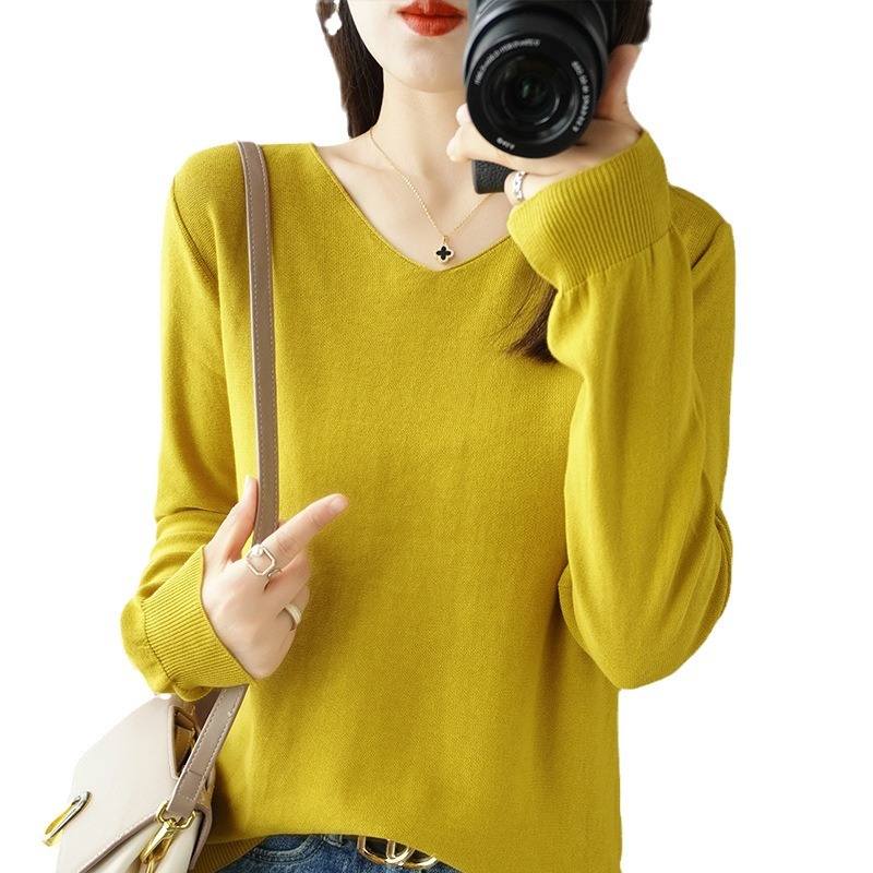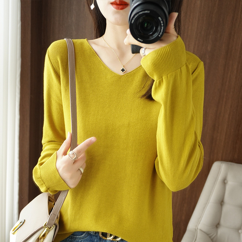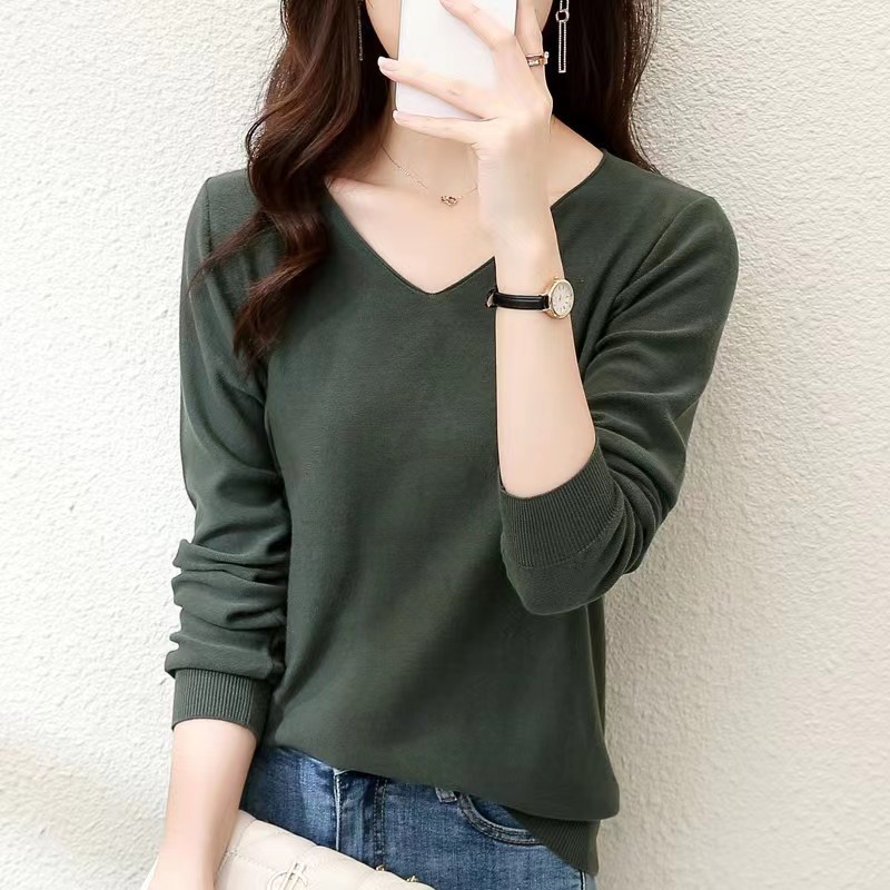跨境秋季棉线针织打底衫女士v领套头毛衣纯色宽松休闲长袖黑
