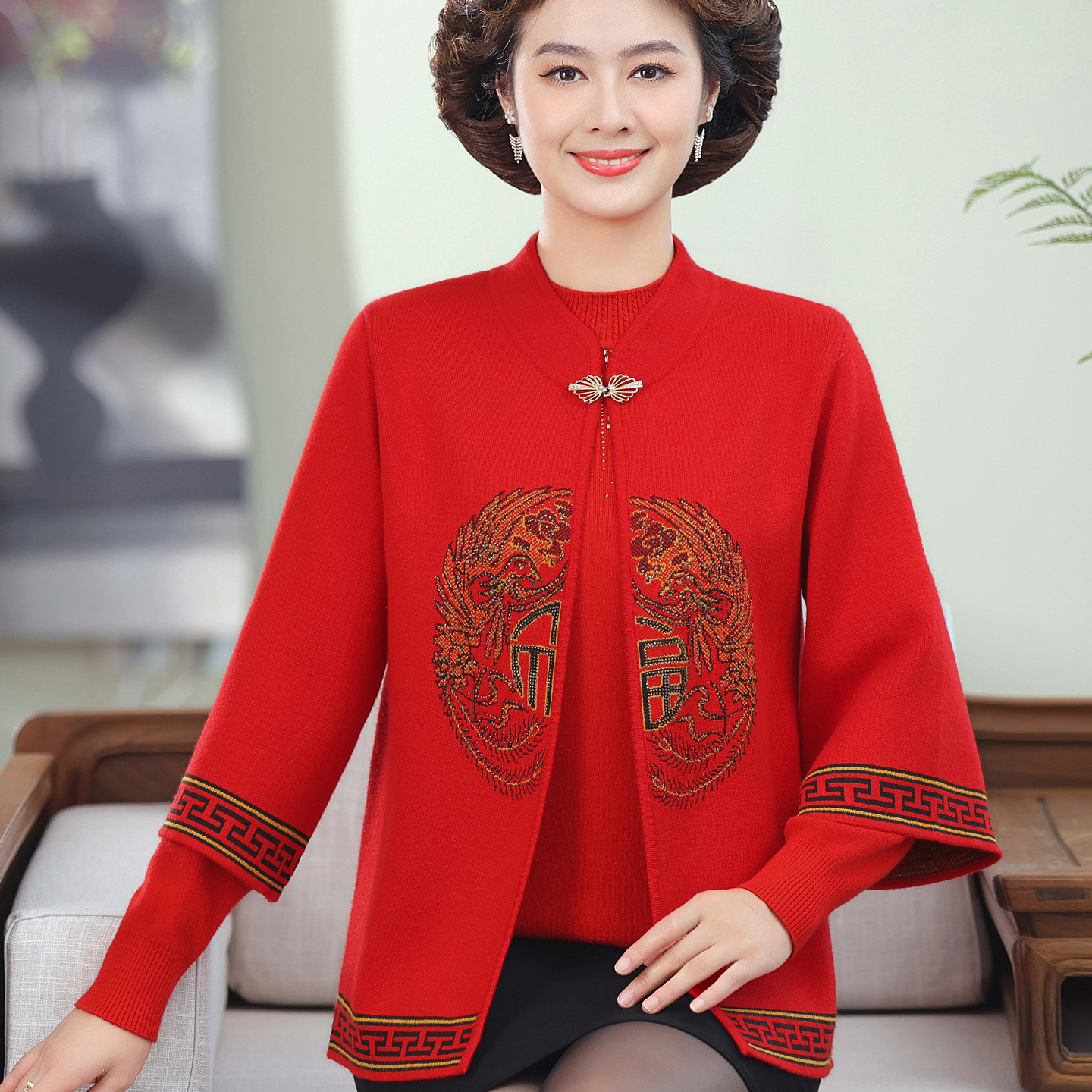 妈妈装秋冬新款国风针织衫两件套中老年女装新中式加厚毛衣外套女