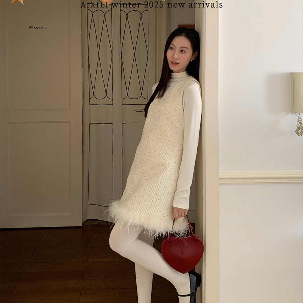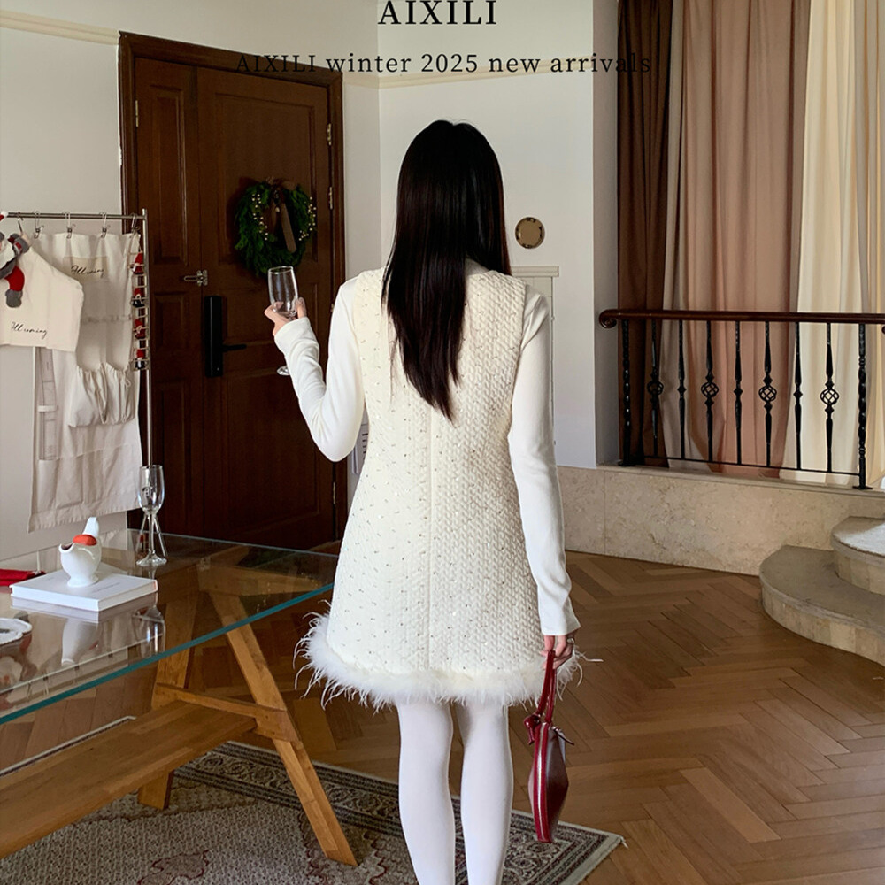 爱西里冬季新款法式高级氛围感V领毛毛边重工小香风背心连衣裙女