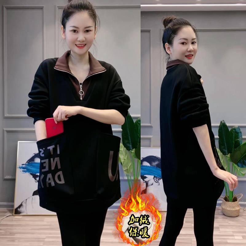 2025春秋冬新款爆款大码宽松中长款上衣遮屁股洋气口袋加绒卫衣女