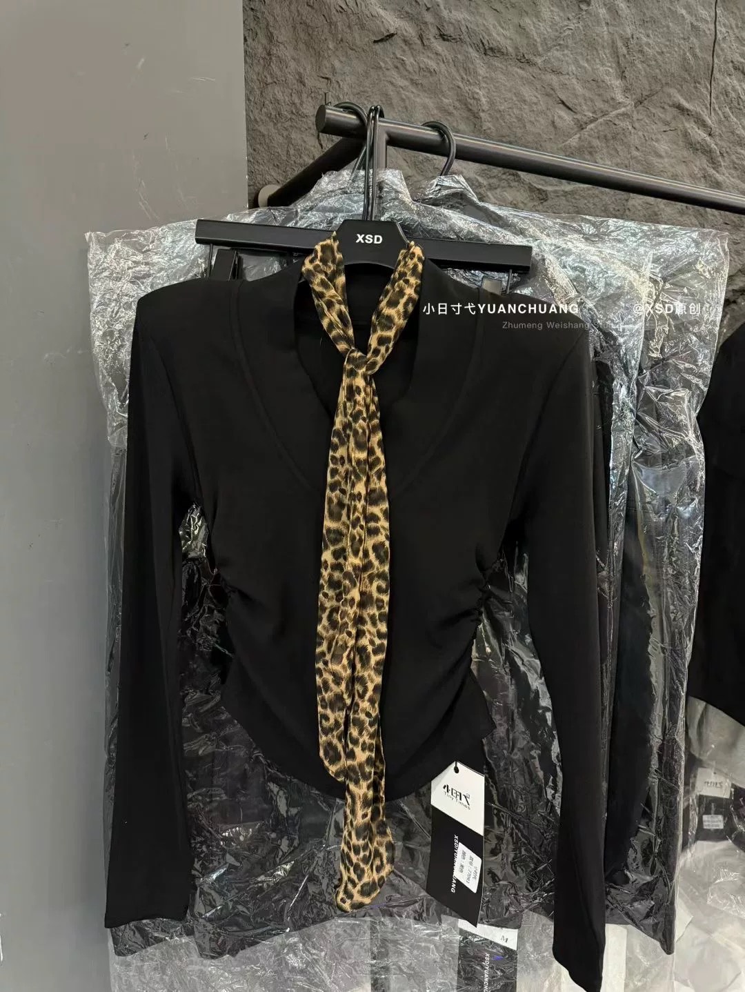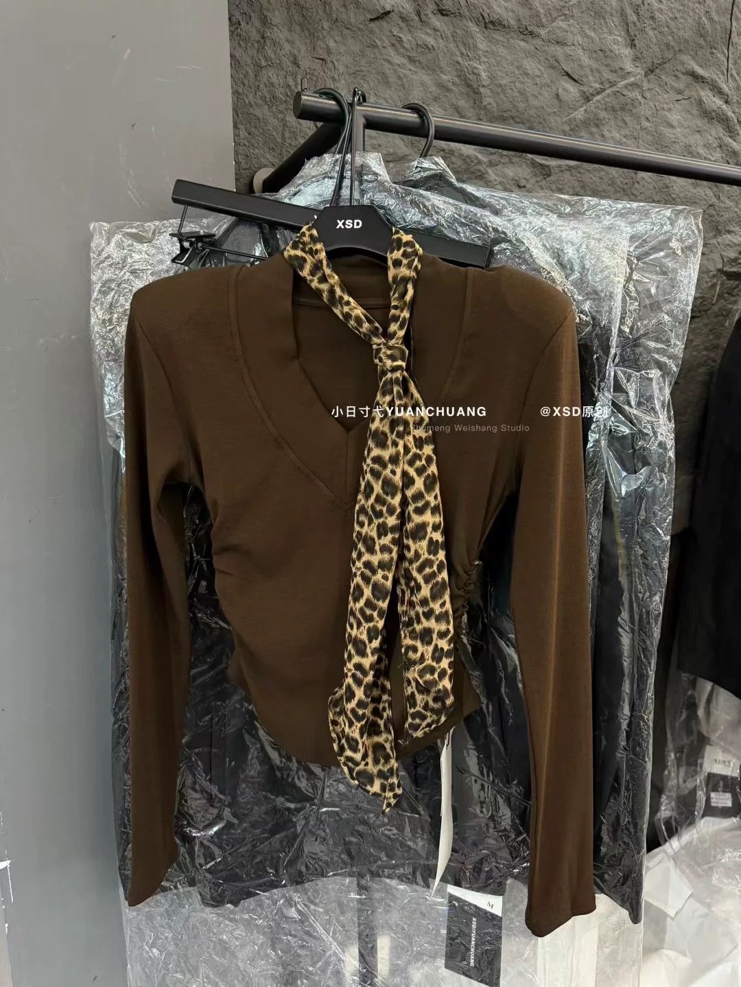2025秋冬磨毛绒韩版V领长袖皱褶掐腰T恤女打底衫上衣配豹纹丝巾