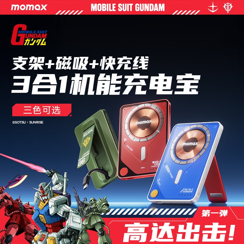 Momax摩米士高达联名磁吸充电宝三合一超薄自带线支架移动电源