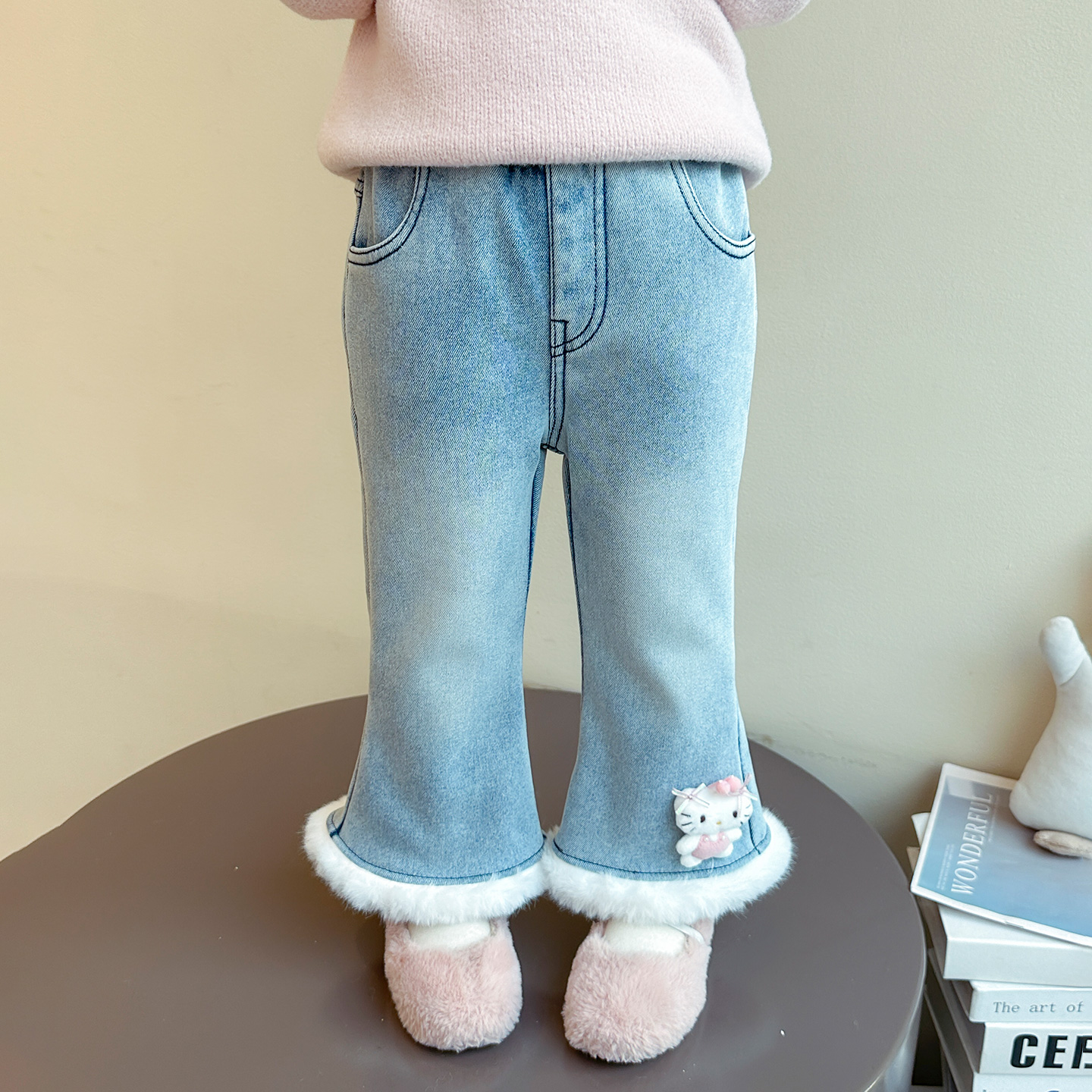 女童喇叭裤子加绒2025新款儿童加厚秋冬季一体绒女宝宝猫咪牛仔裤
