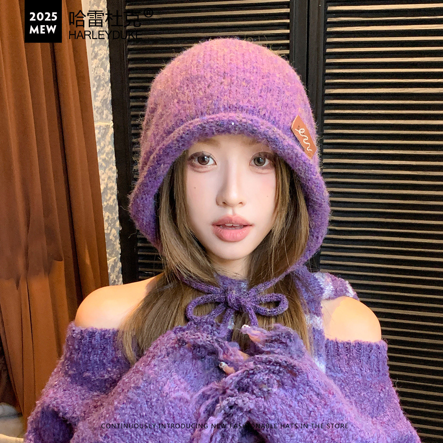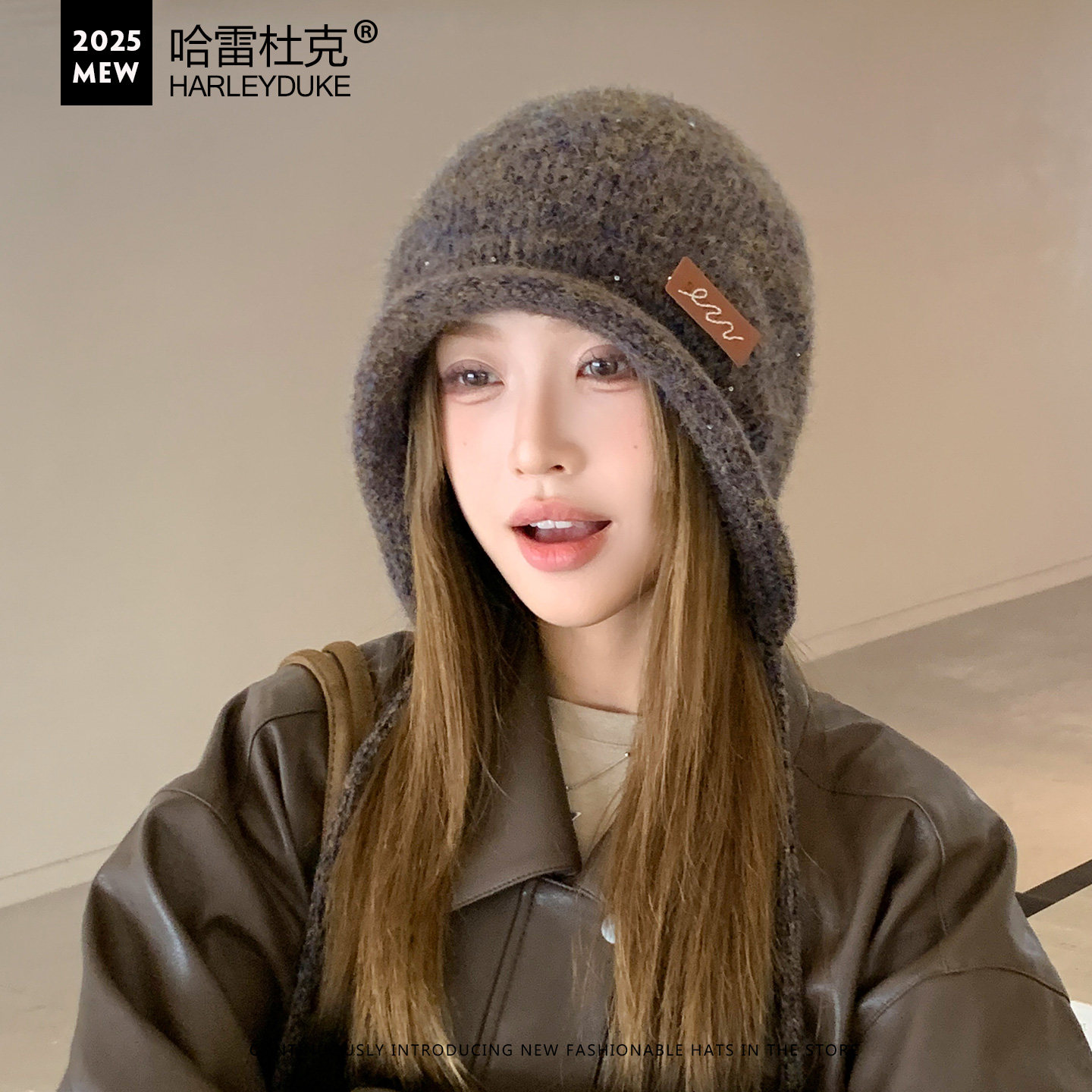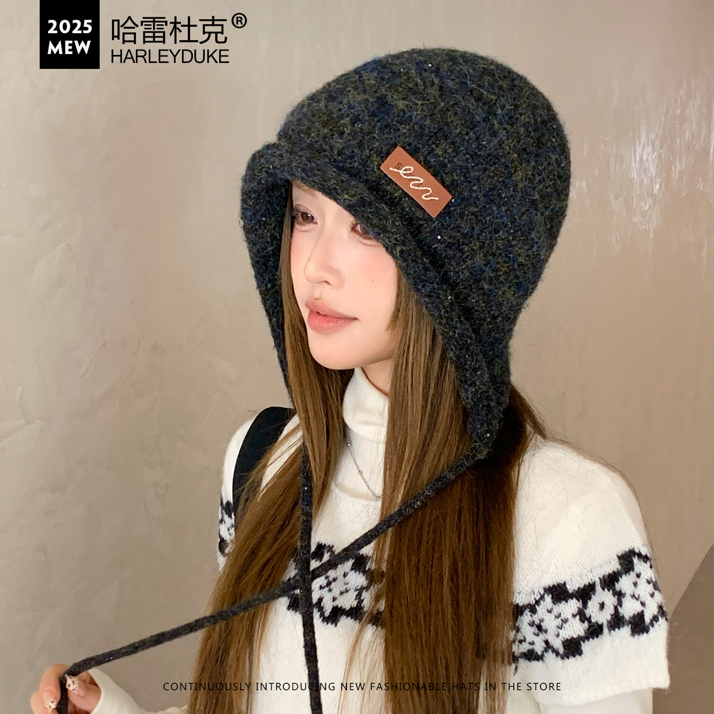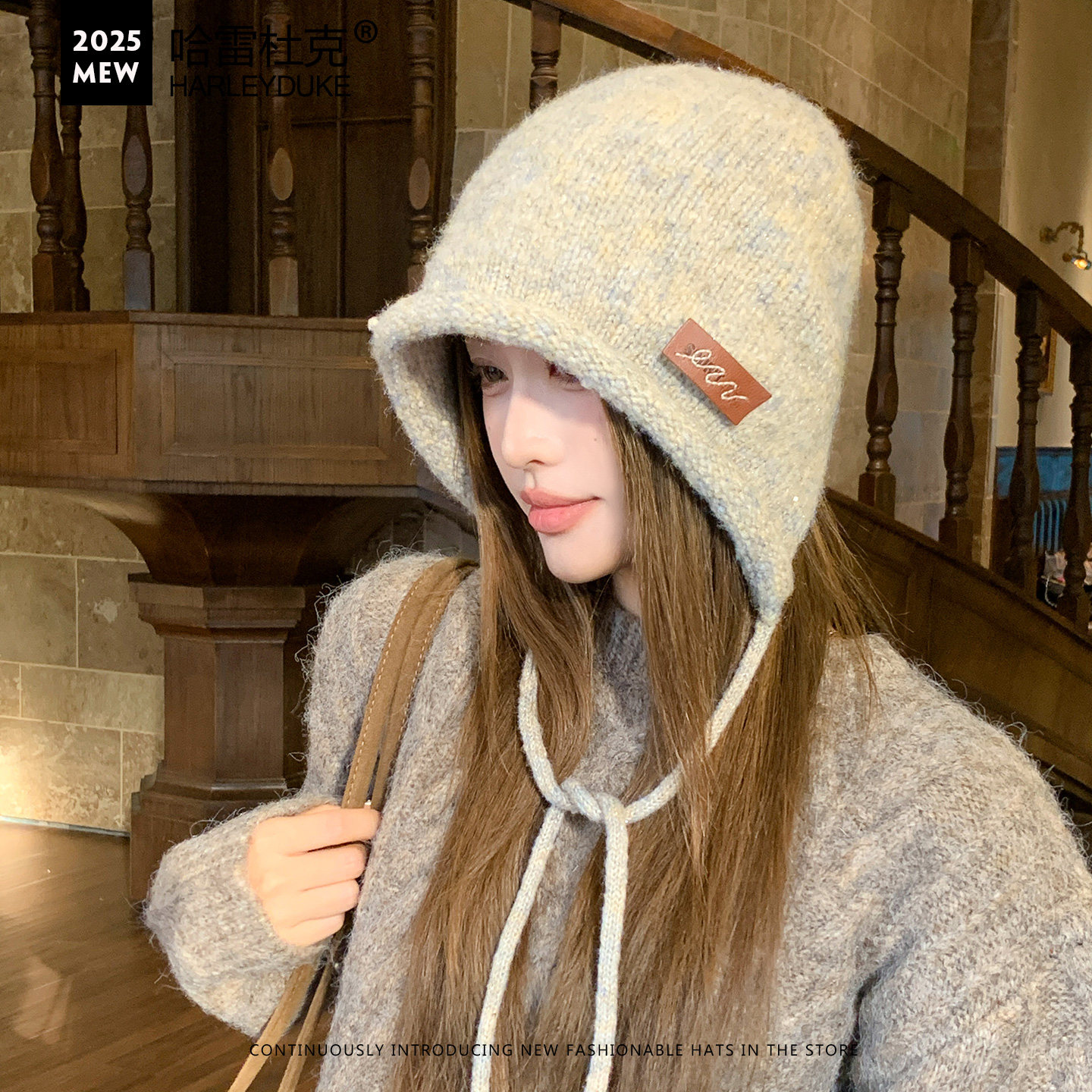 卷边显脸小系绳护耳帽子女生秋冬天保暖针织帽子出游防寒毛线卫帽