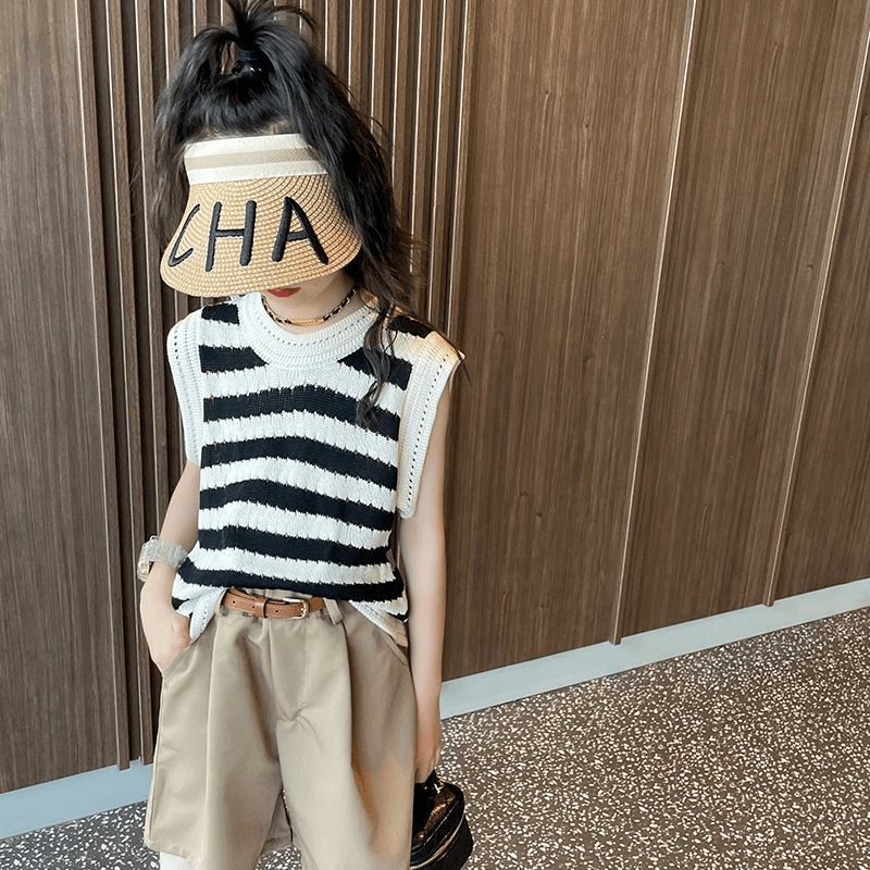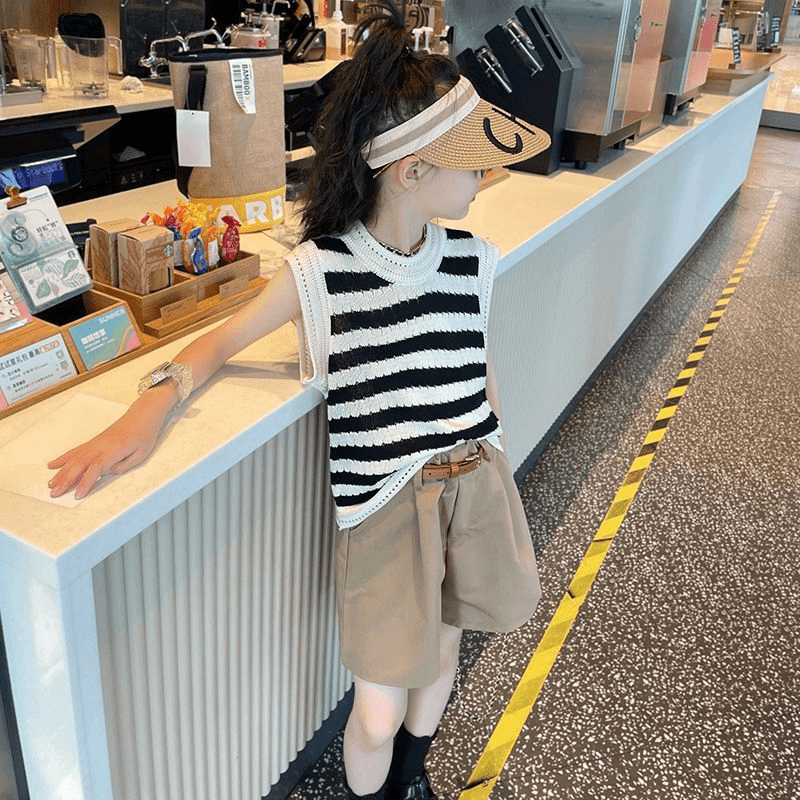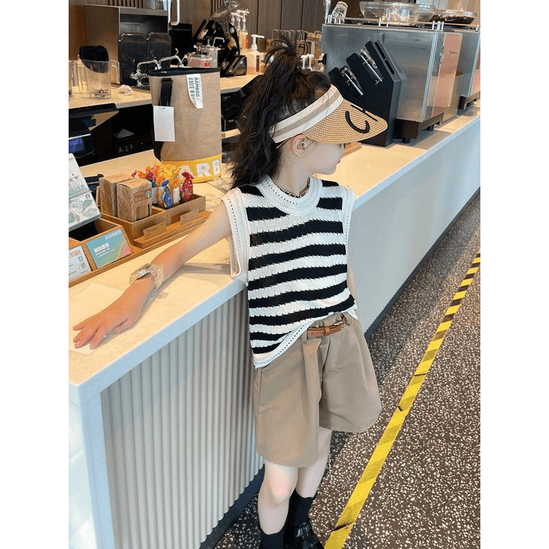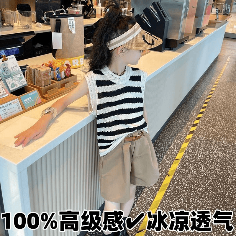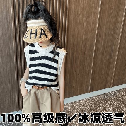 女童无袖背心外穿夏季网红炸街休闲宽松条纹针织镂空冰丝马甲上衣