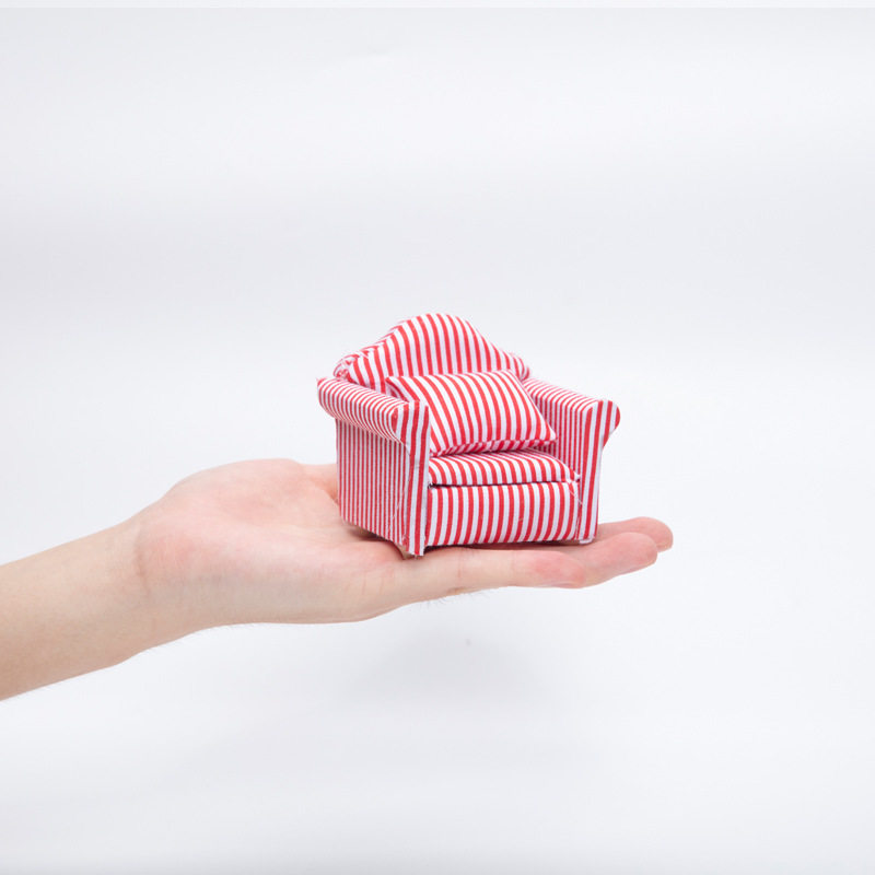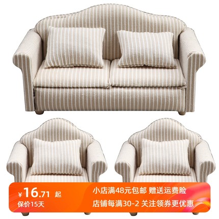 微缩小沙发条纹格子布艺单双人沙发娃娃屋迷你模型场景摆件含靠枕