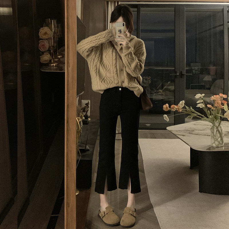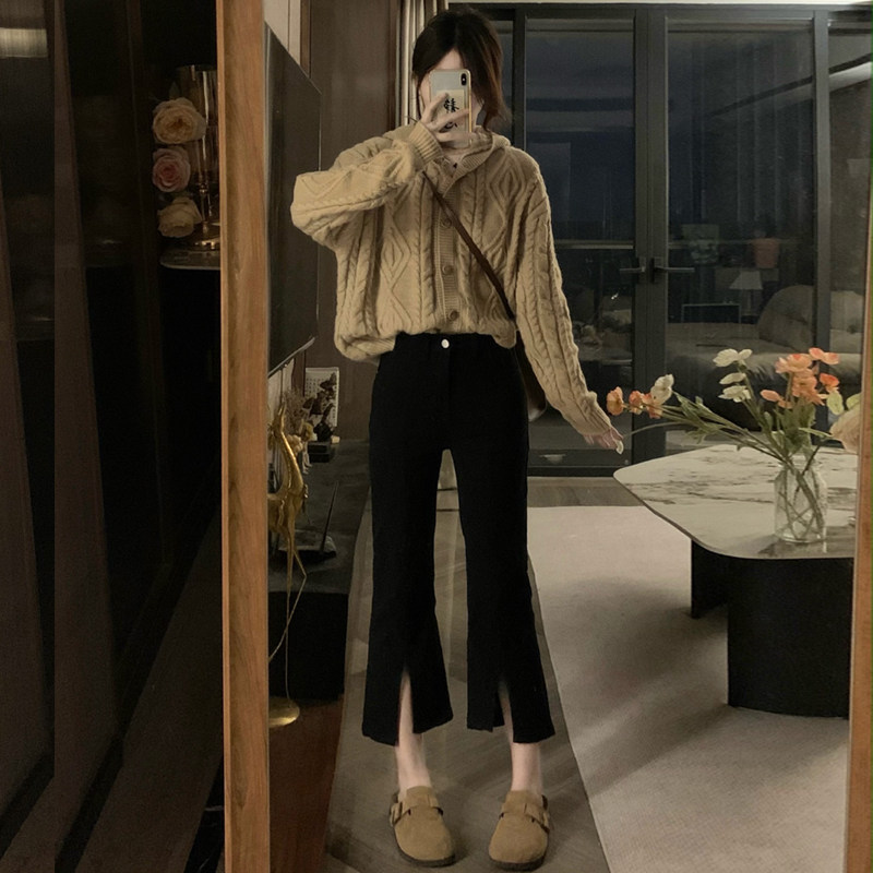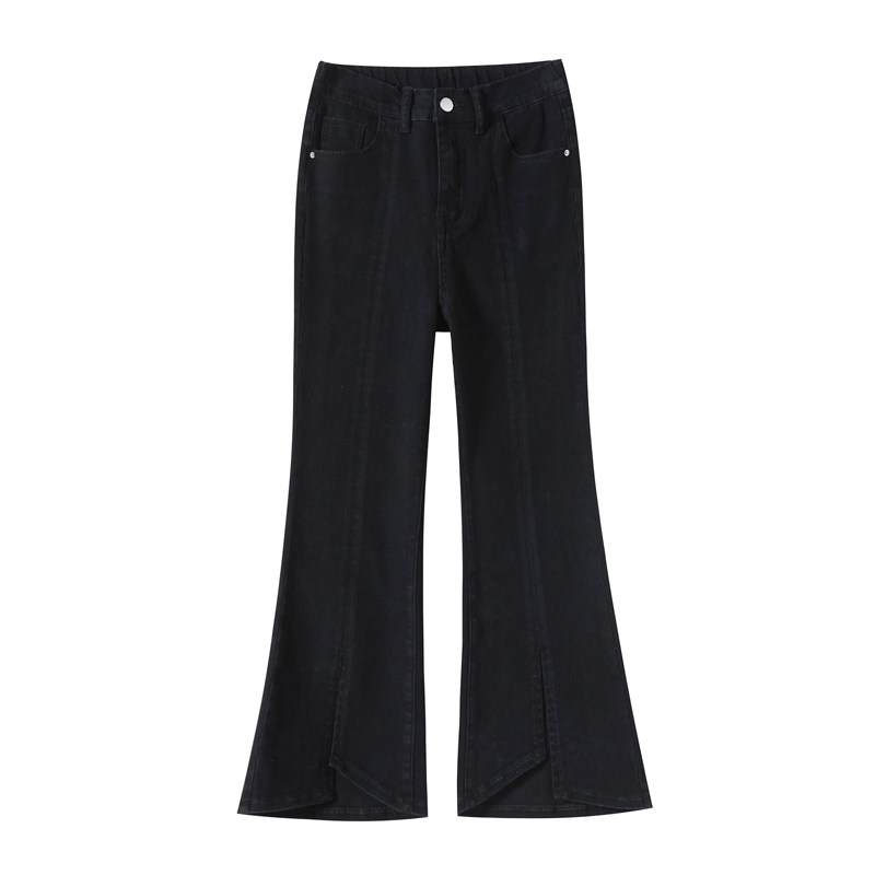 黑色开叉微喇叭牛仔裤女小个子显高七分裤子设计感直筒烟管裤xs码