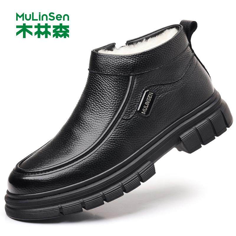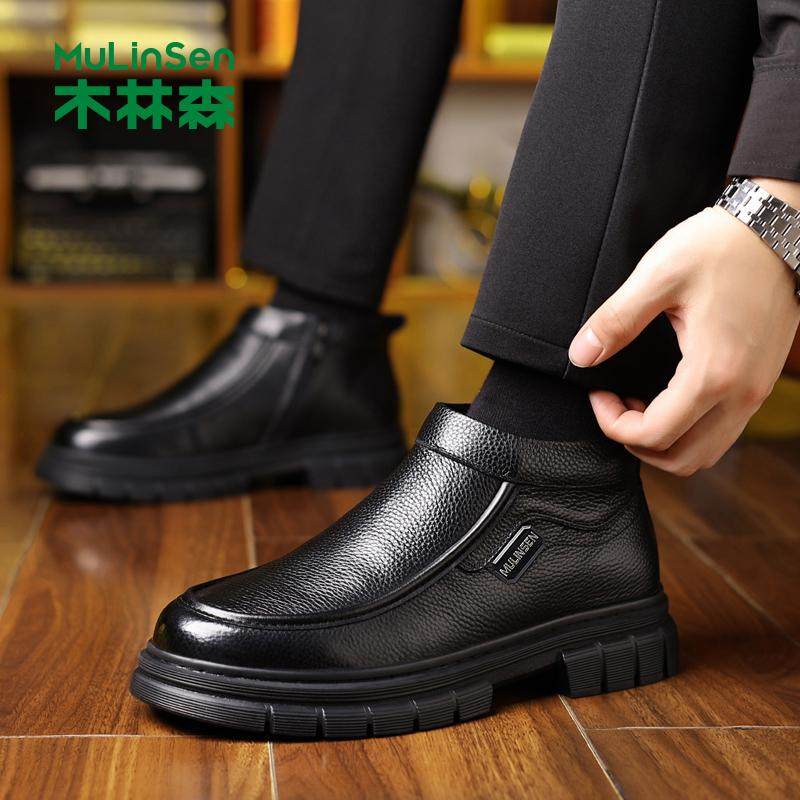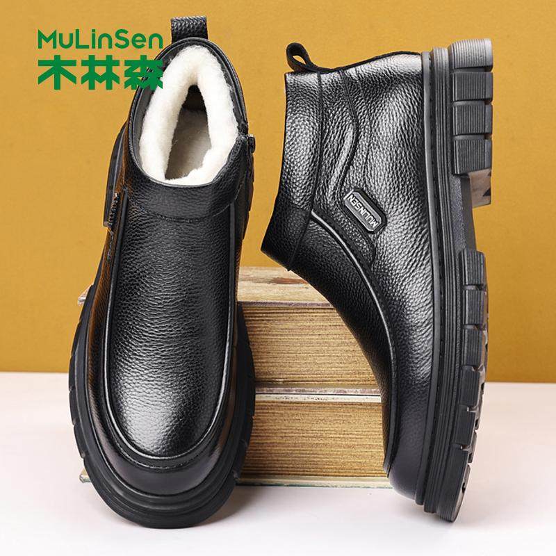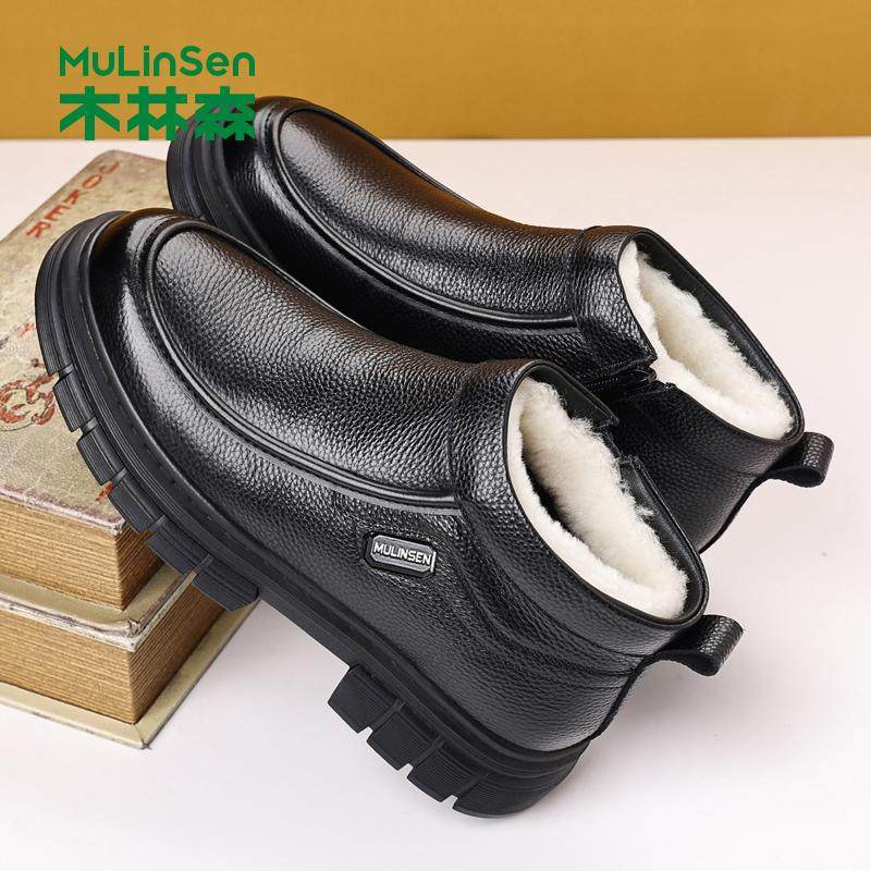 木林森男鞋2025冬季头层牛皮加绒羊毛高帮棉鞋男保暖爸爸真皮鞋子