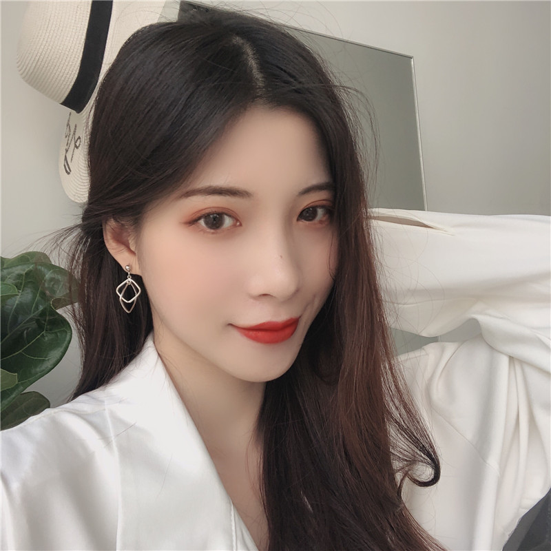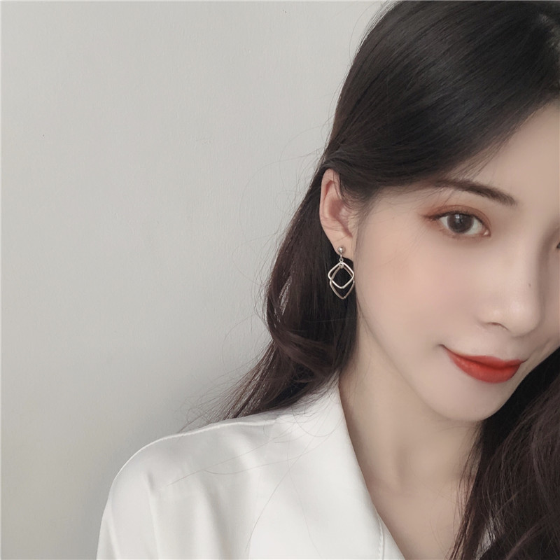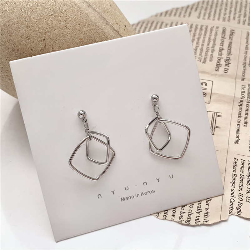 S925银针 韩国气质简约几何镂空方形拼接耳环女个性百搭耳钉B321