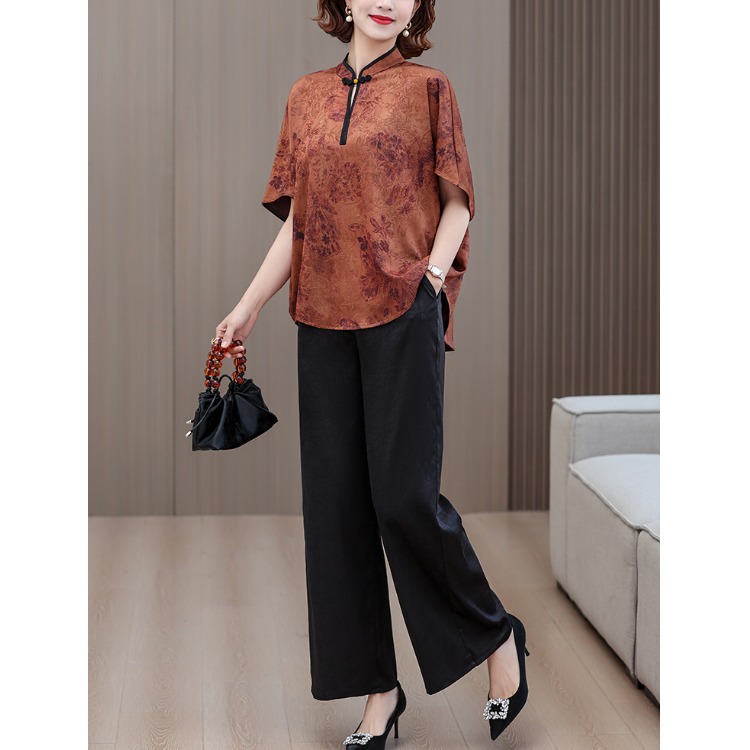 时尚高端中式香云纱套装女春夏新款气质妈妈宽松上衣阔腿裤两件套
