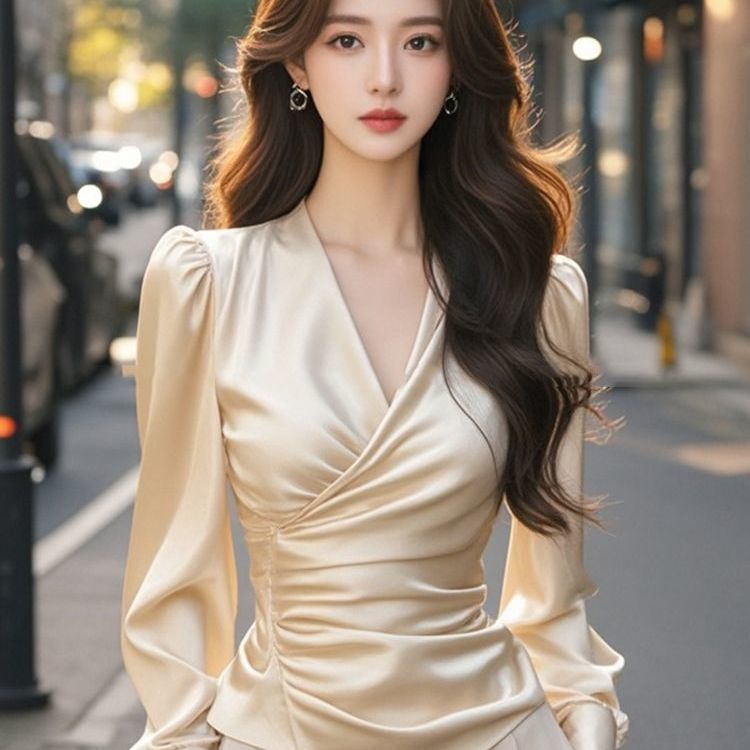 御姐风V领交叉长袖收腰显瘦短款衬衫春季缎面新款洋气轻奢上衣女
