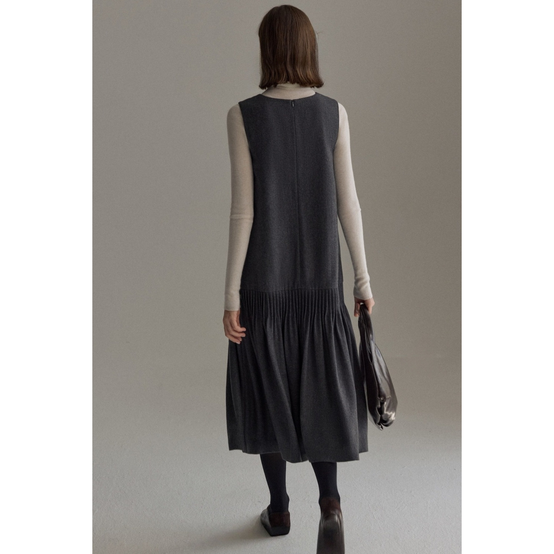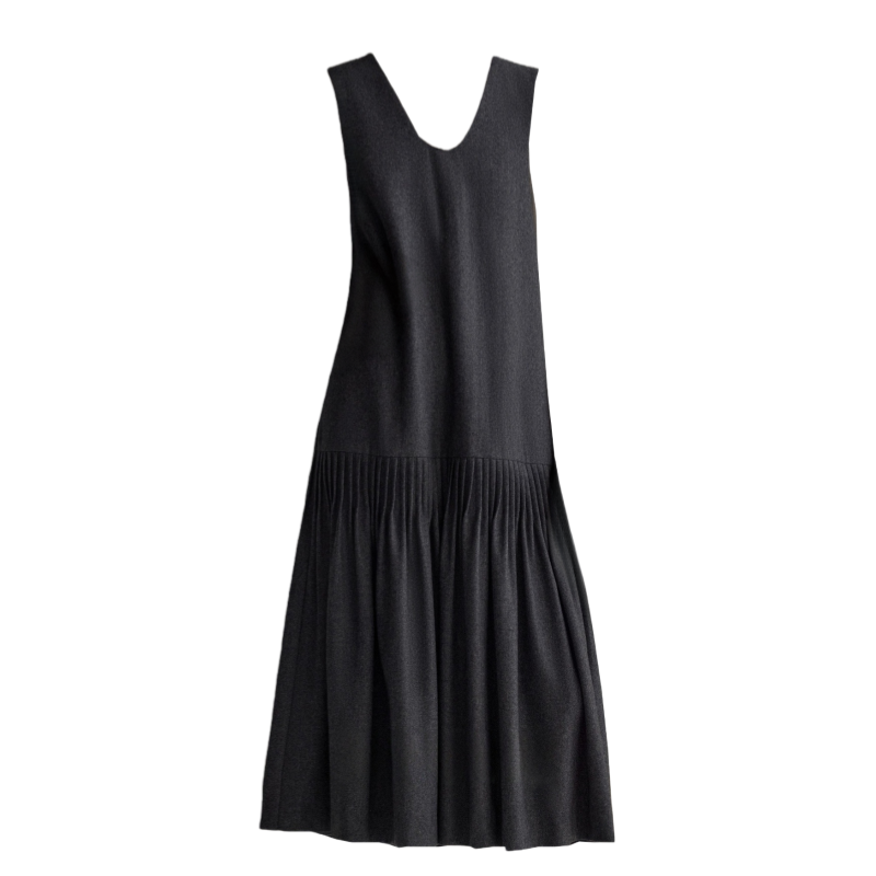 文艺气质塔克褶斜纹内搭低腰V领无袖背心裙女 显瘦褶皱中长连衣裙