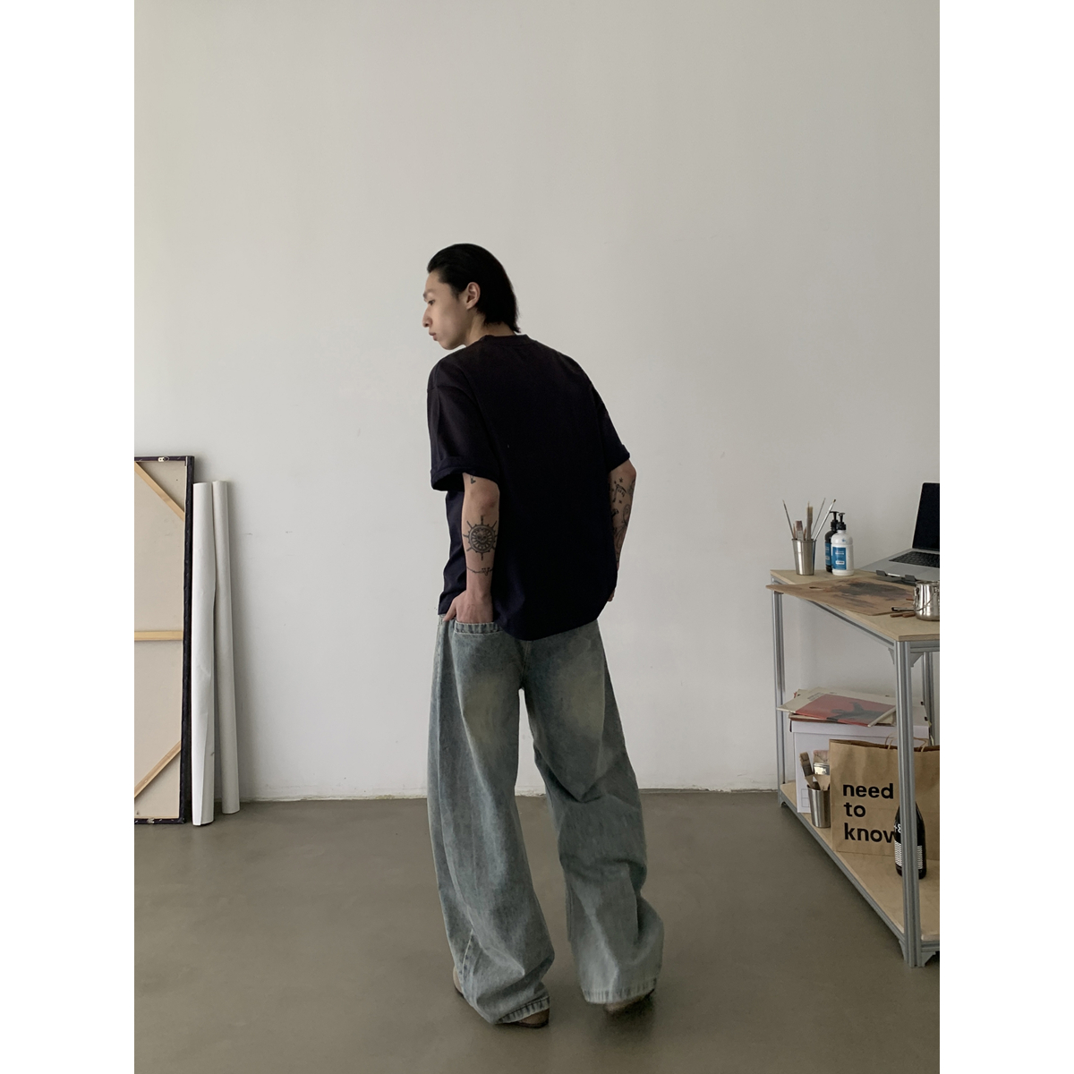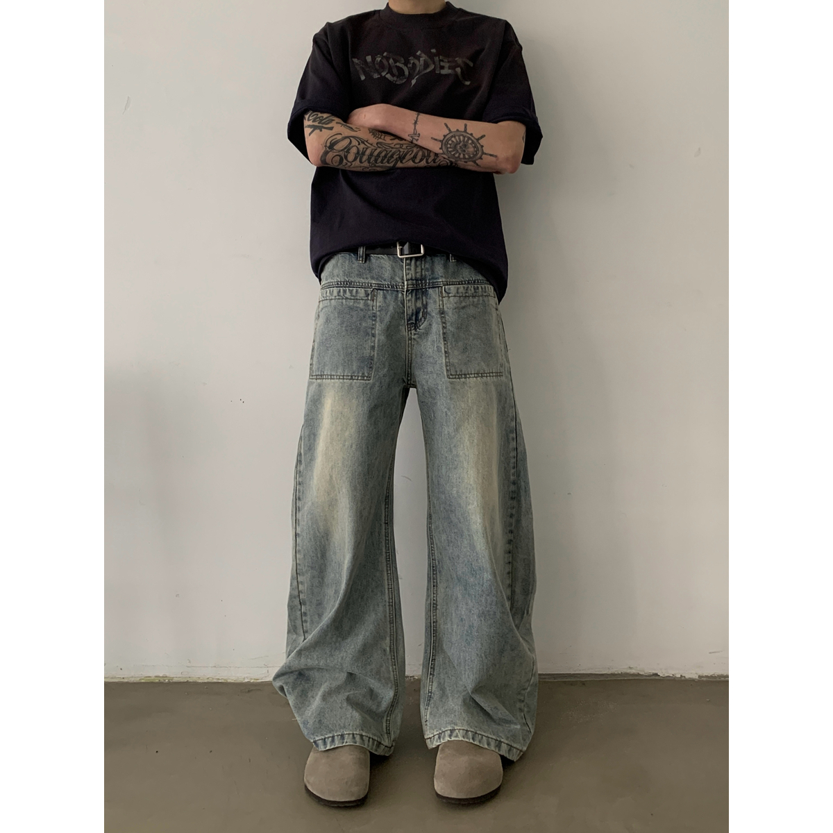 INKNOTS美式复古水洗弯刀baggy牛仔裤男女宽松前口袋设计休闲裤潮