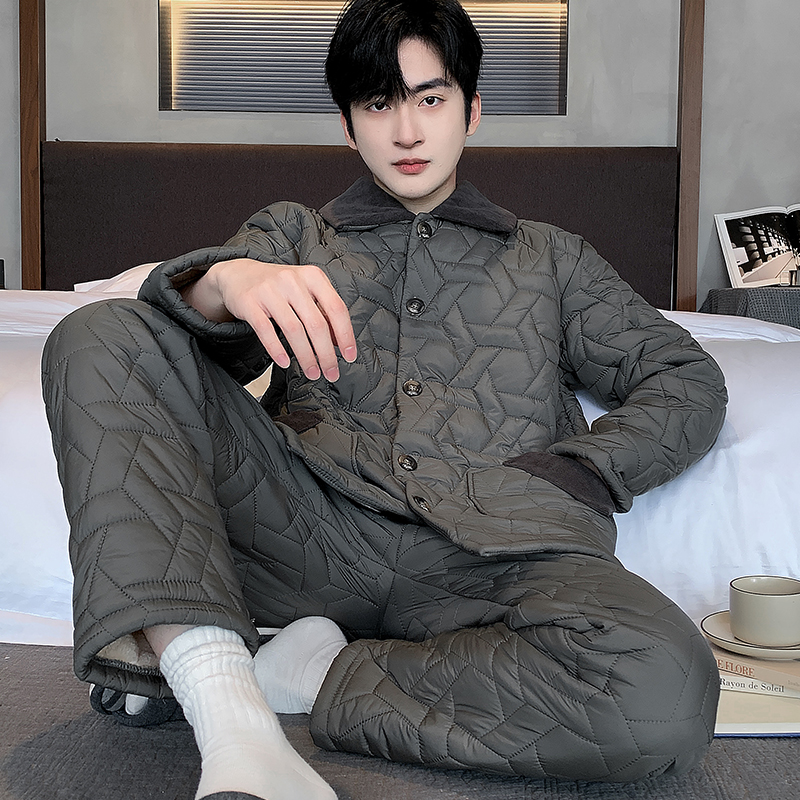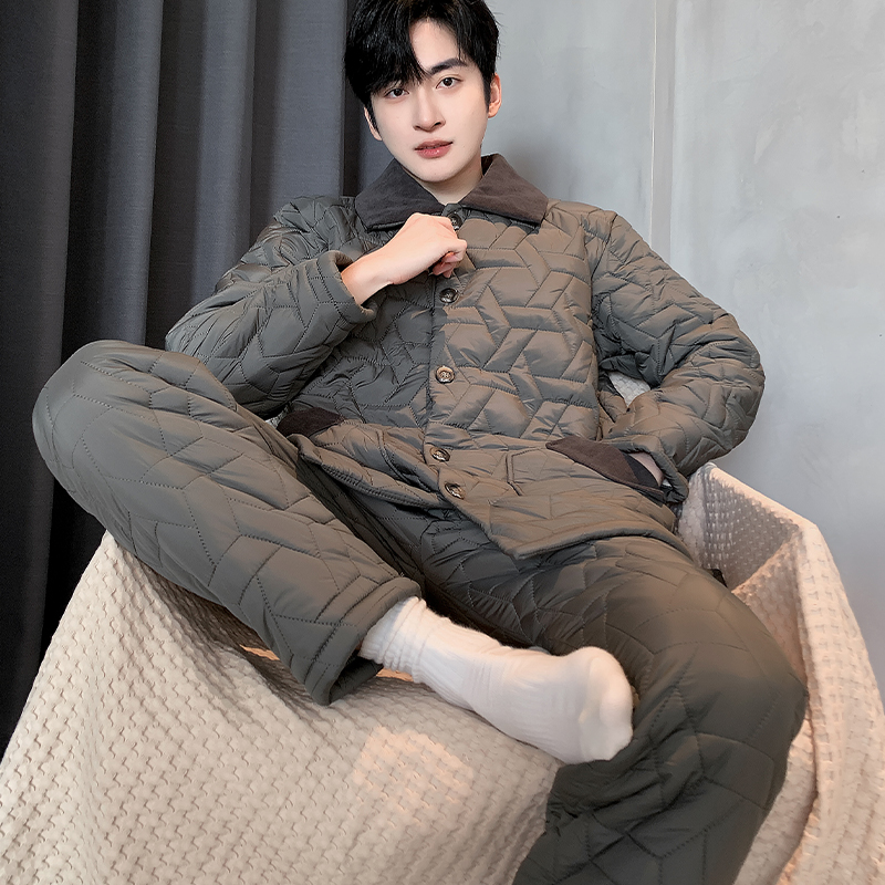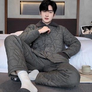 猫人羽绒睡衣男士冬季三层加厚夹棉保暖家居服套装大码可外穿棉袄