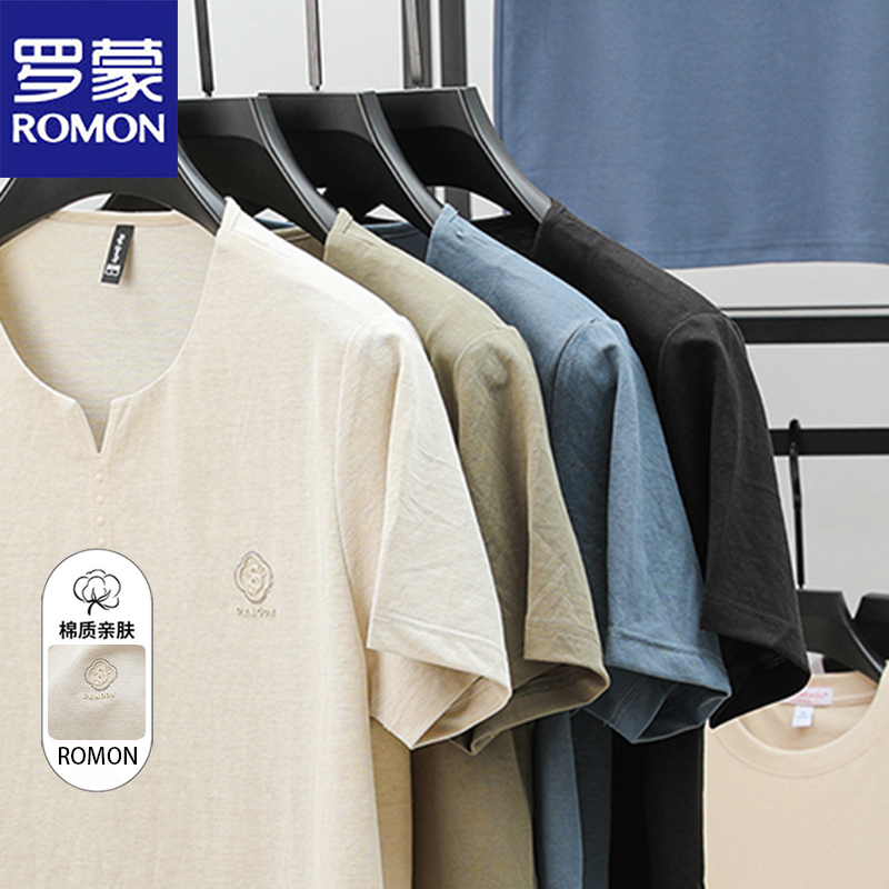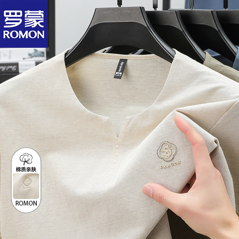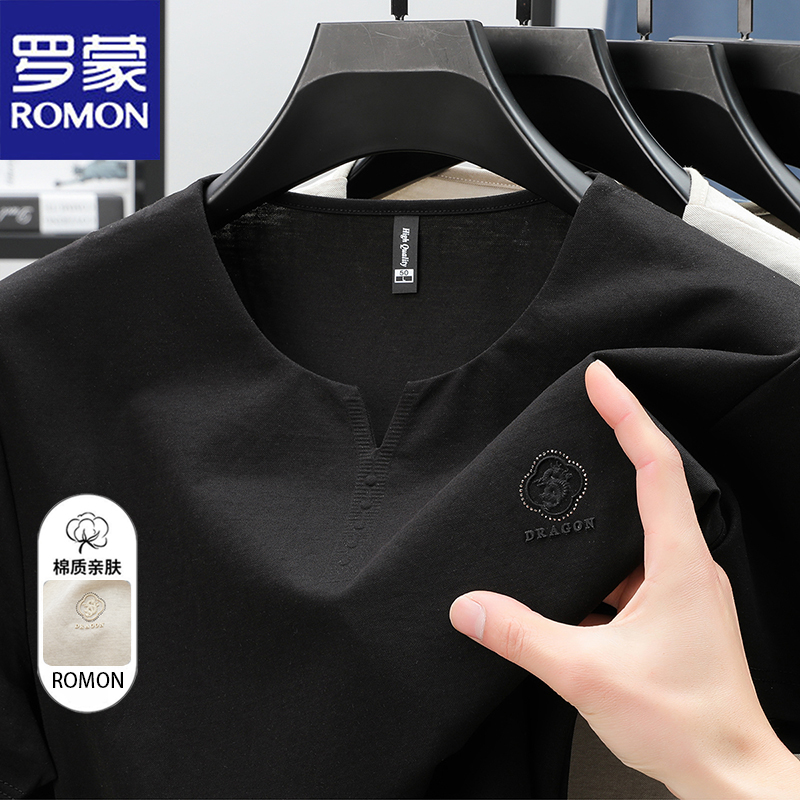 罗蒙夏季新款棉短袖t恤男士商务休闲v领冰丝速干刺绣抗皱百搭汗衫