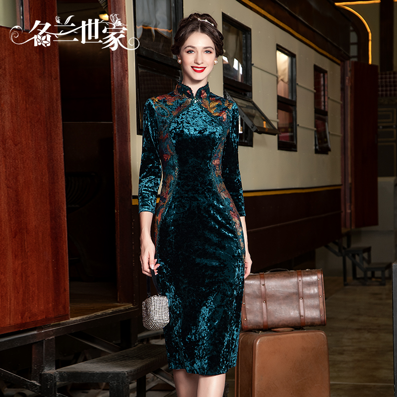 名兰世家复古新中式旗袍改良高端奢华丝绒连衣裙宴会礼服长裙原创