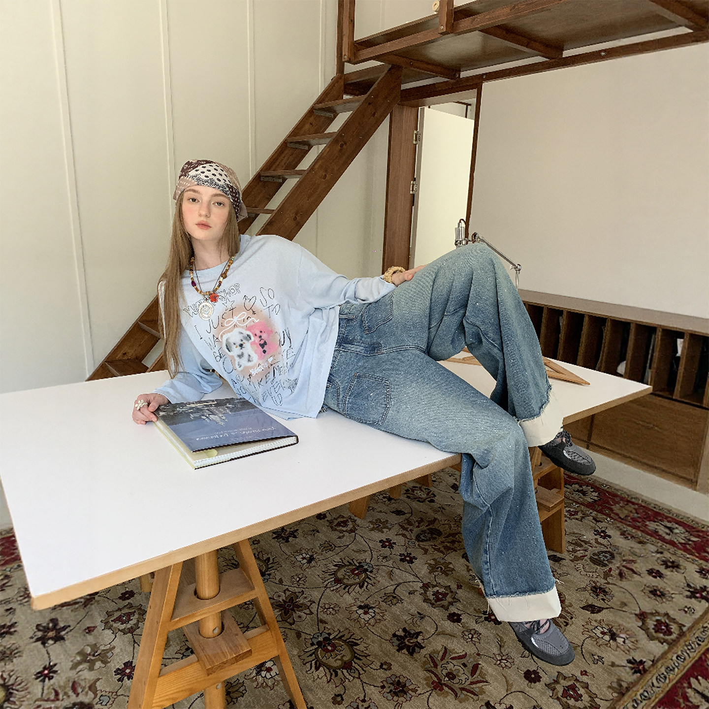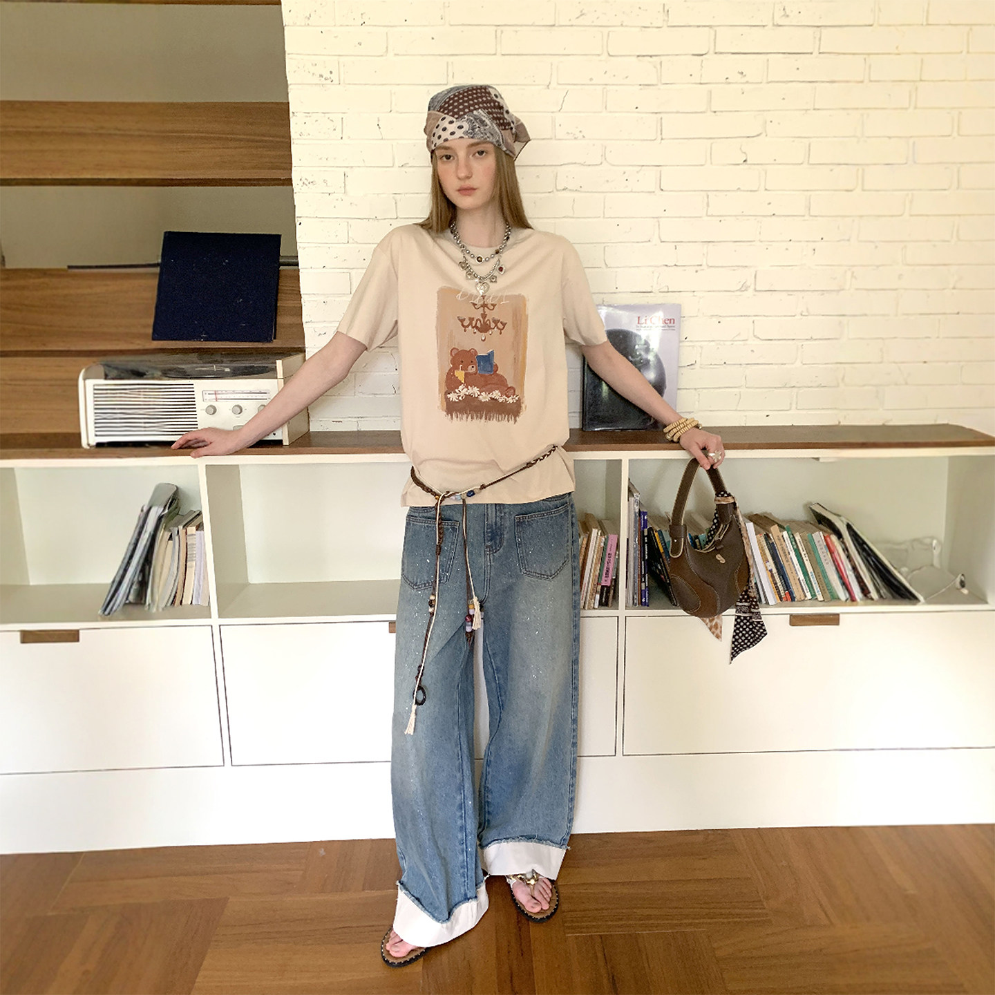 DIDDIMODA挺括柔软舒适直筒百搭翻边撒银牛仔裤女夏薄款