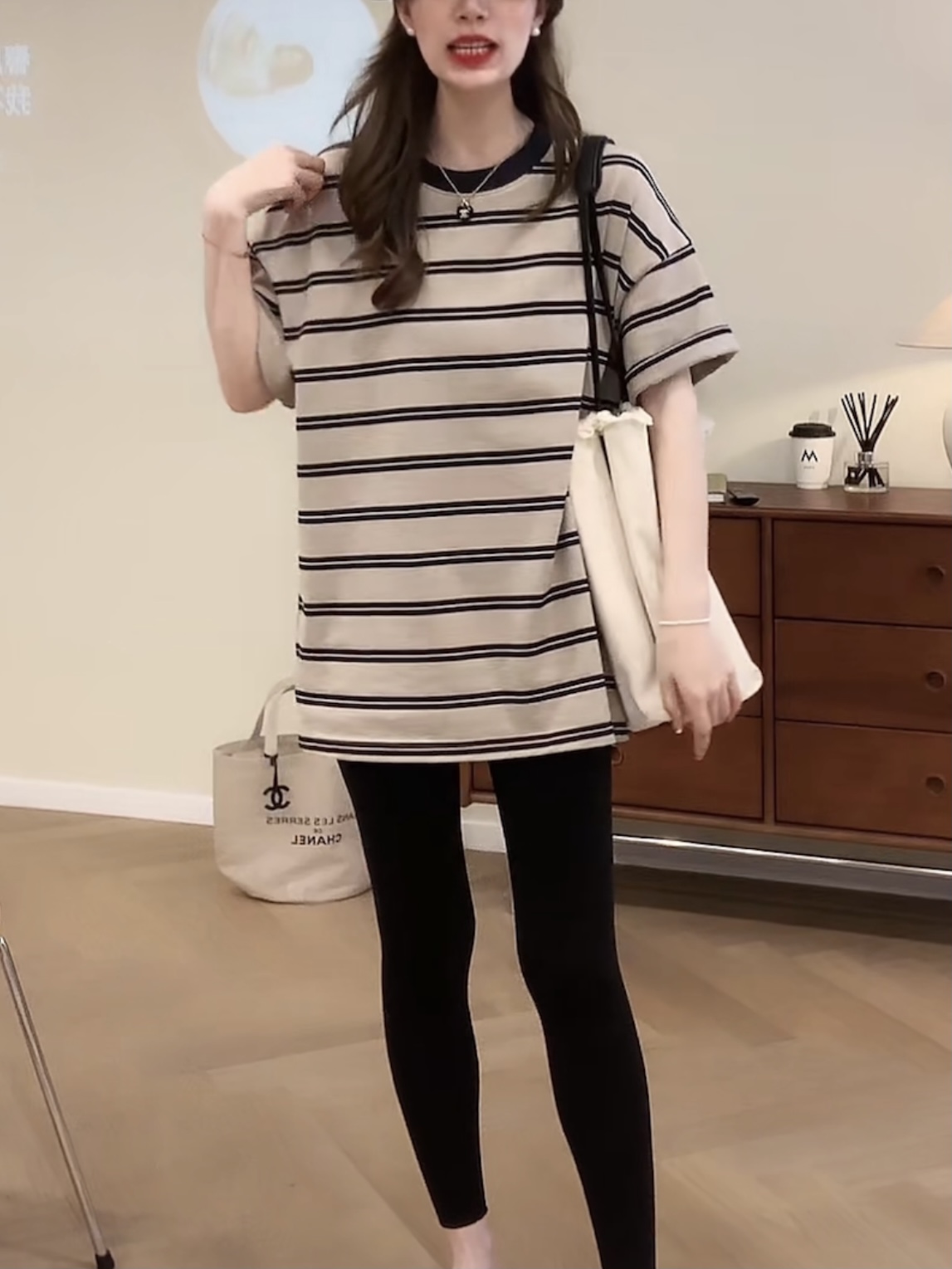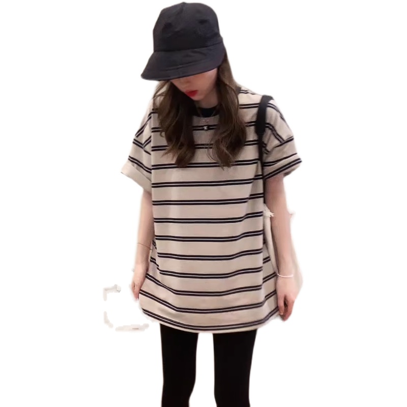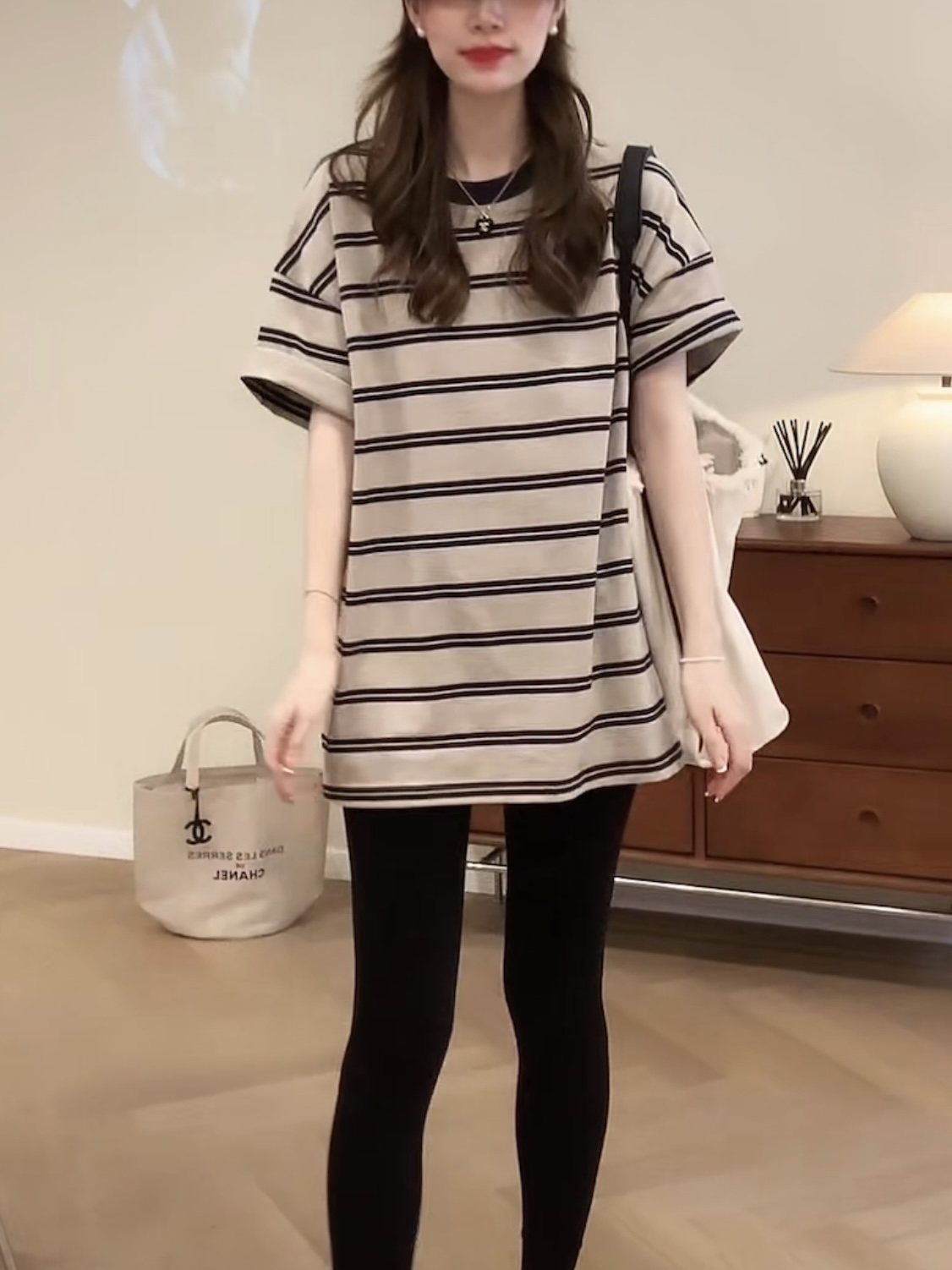 欧货条纹大版短袖T恤女2023夏季新款宽松百搭小众设计感大码上衣