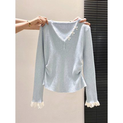 蕾丝边蝴蝶结V领长袖针织衫女冬季新款褶皱收腰显瘦气质打底上衣