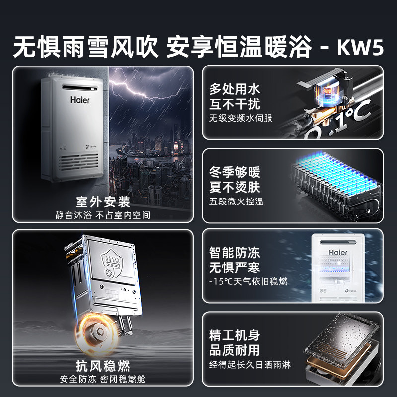 海尔燃气热水器室外机KW5三管零冷水家用天然气16升恒温防冻旗舰