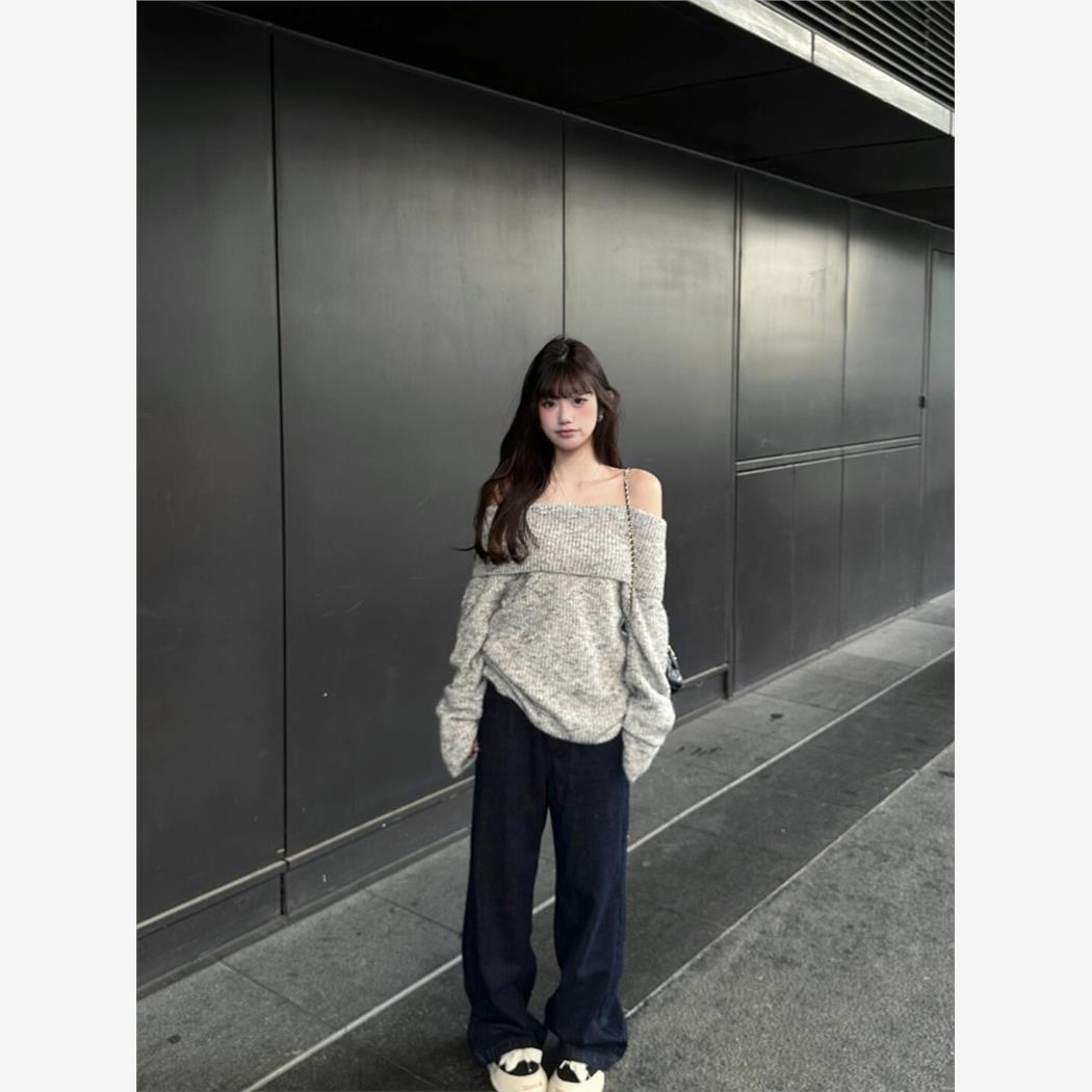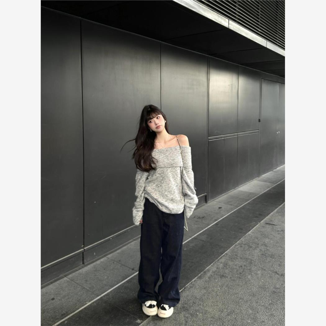 灰色无肩韩式女式套头毛衣,秋季慵懒风格,宽松,休闲,显瘦,小