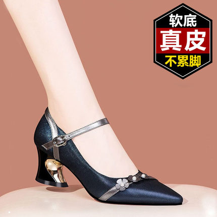 舒适软皮真皮中跟单鞋女粗跟2025春秋新款尖头一字带舒适低跟女鞋