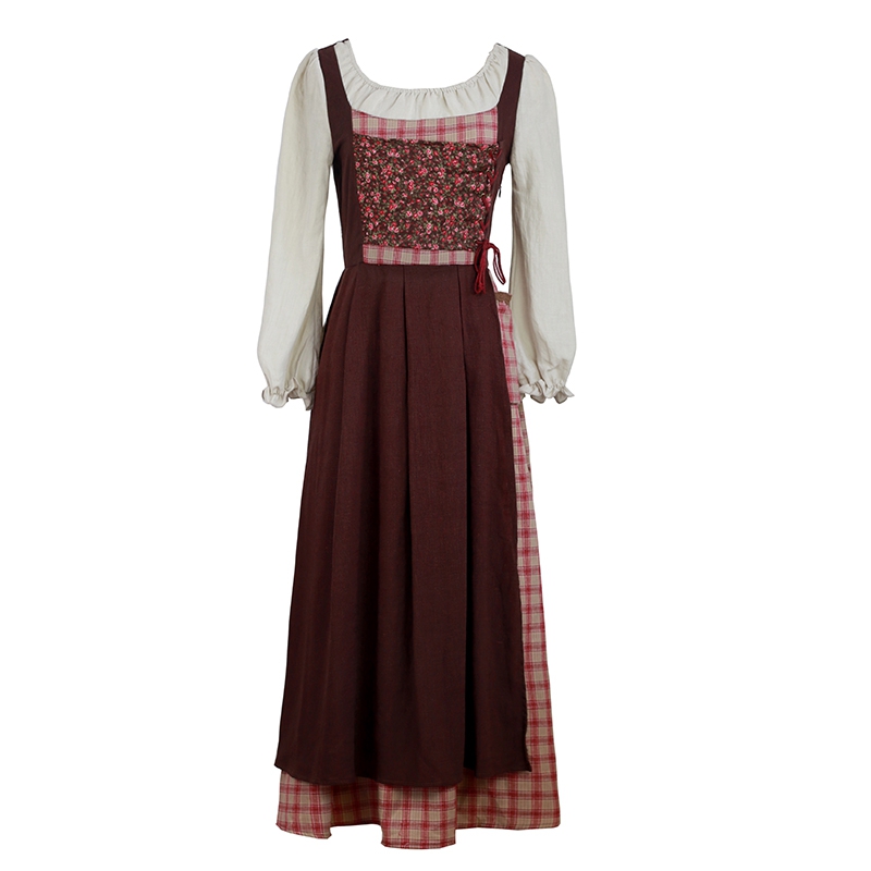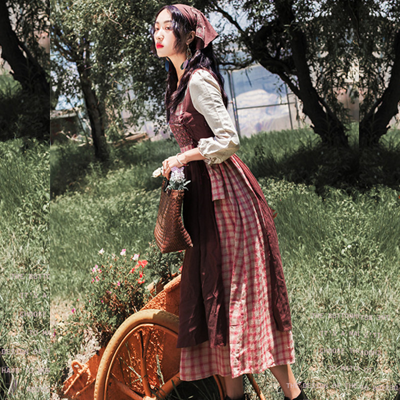 春秋田园风复古宫廷高腰棉麻连衣裙云南青海湖农场旅游拍照长裙女