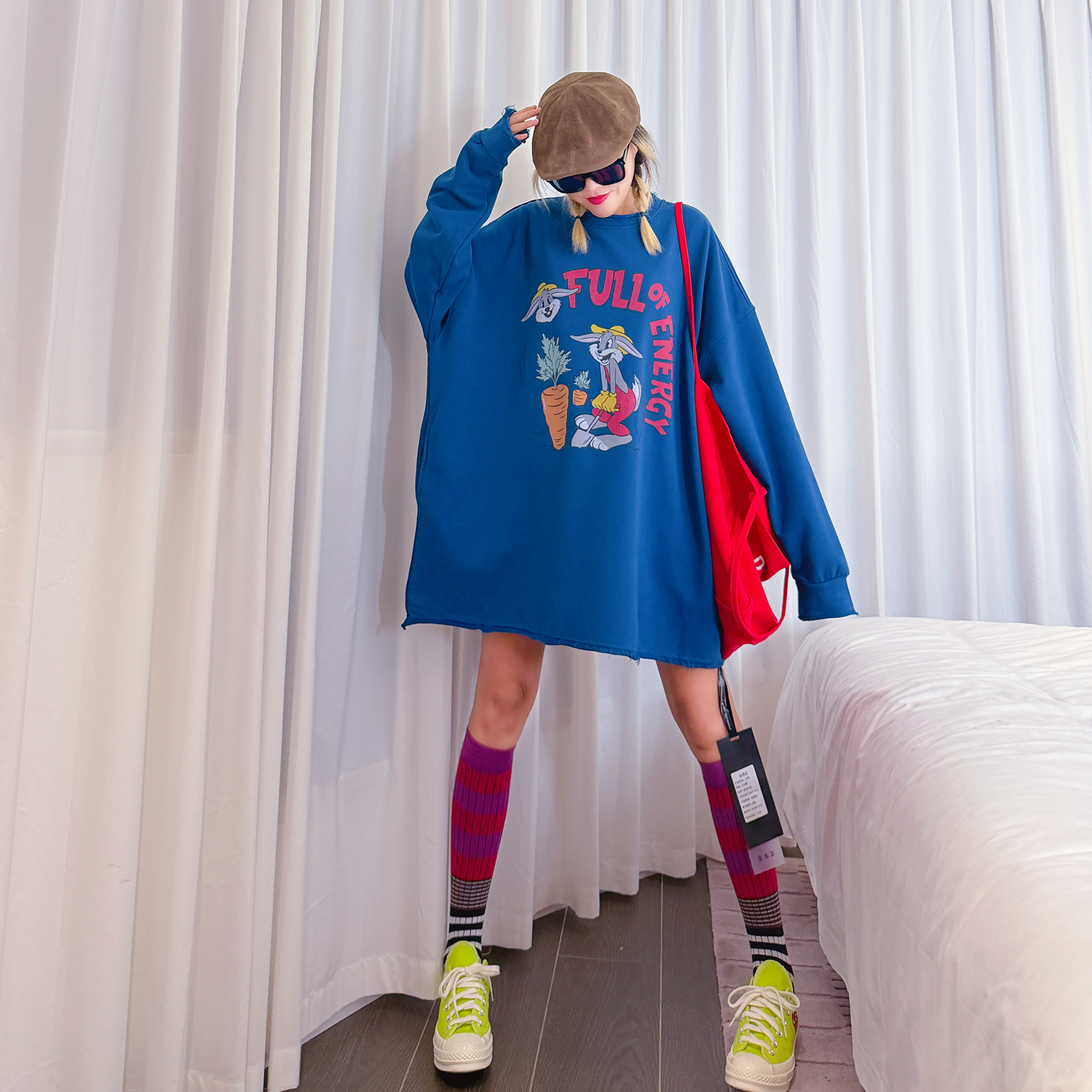 潮牌T秋冬中长款圆领卡通卫衣女百搭显瘦大码上衣纯棉洋气打底衫
