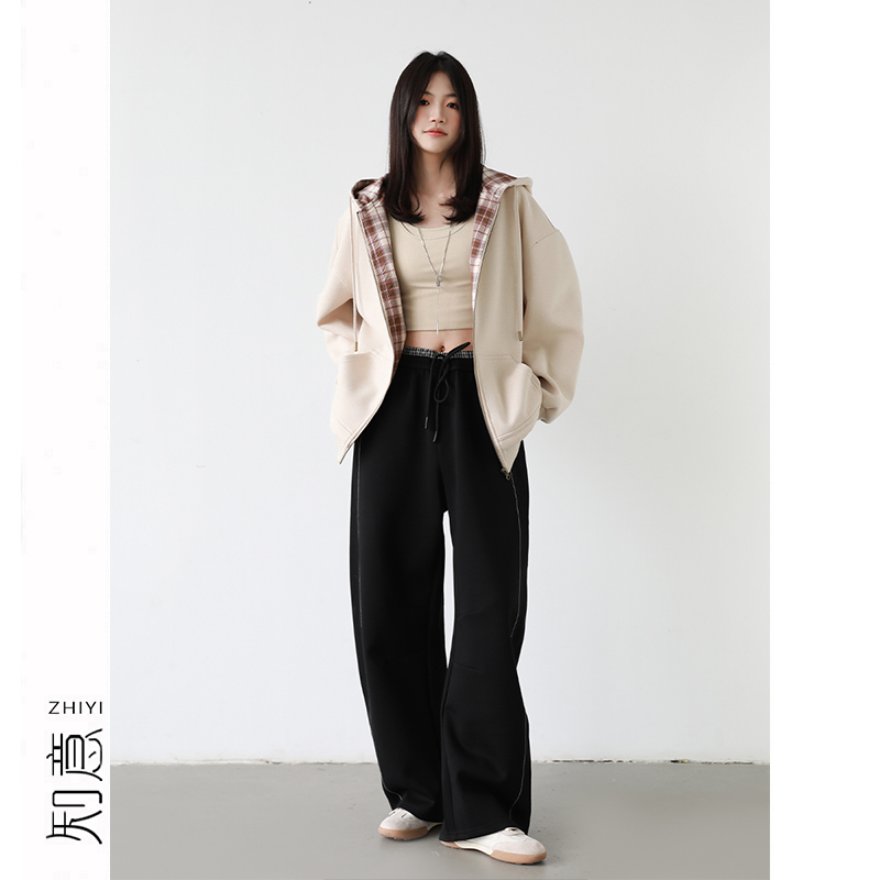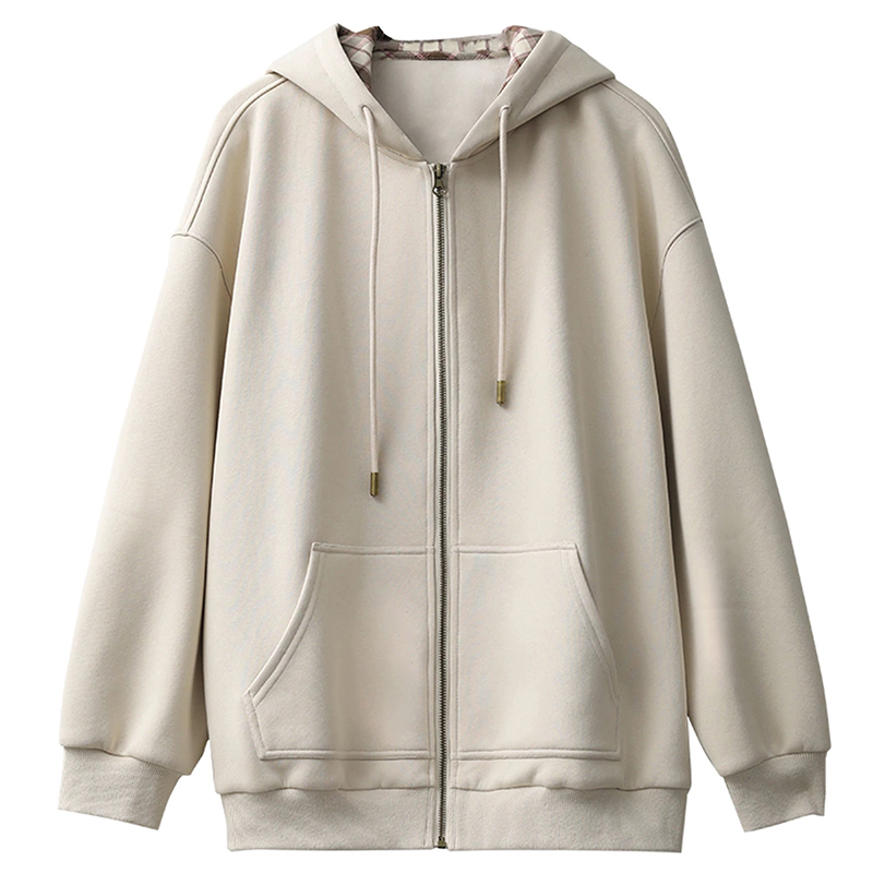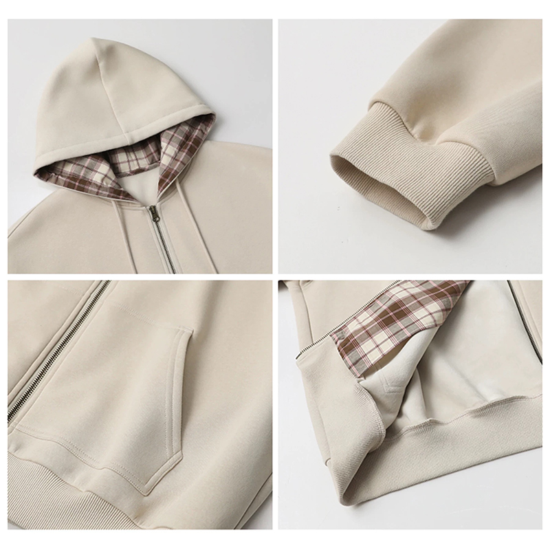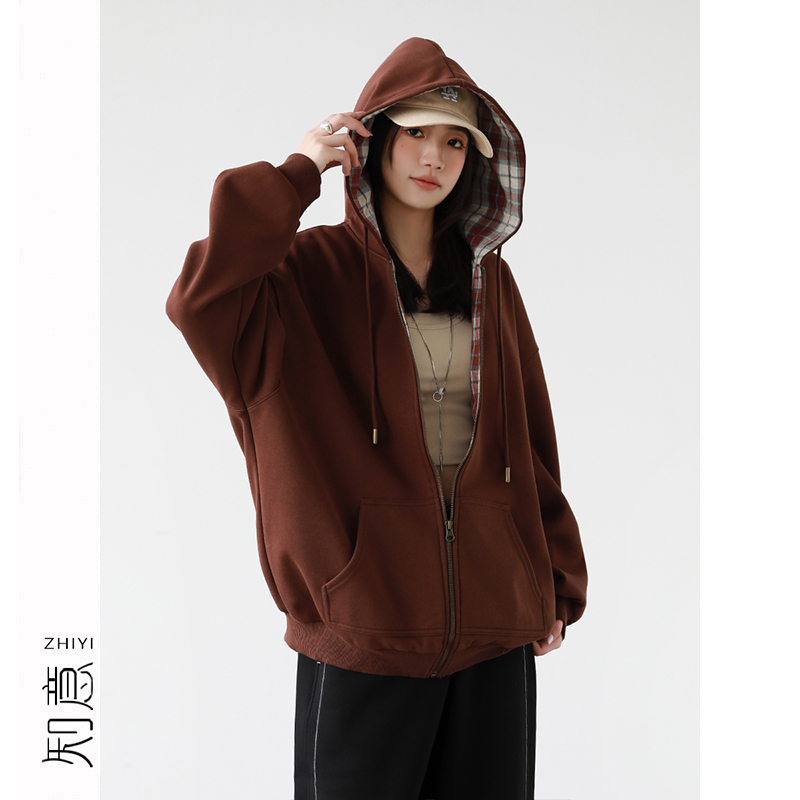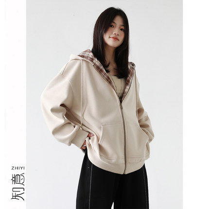 【2.21新品】慵懒撞色格纹拉链开衫女早春连帽银狐绒卫衣外套