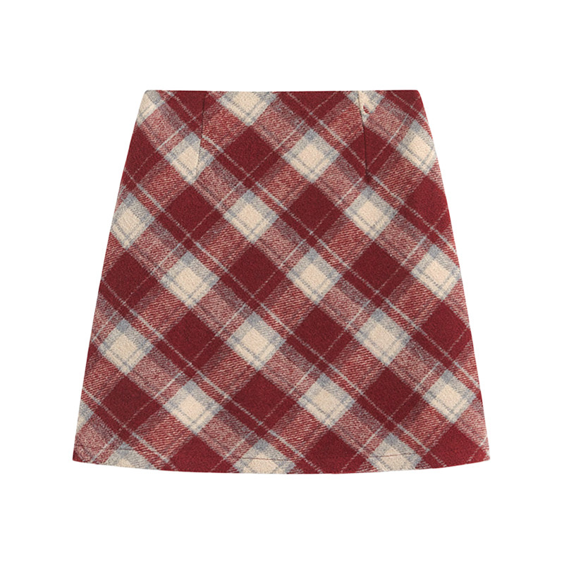 毛呢红色格子半身裙女秋冬微胖mm大码小个子高腰显瘦a字包臀短裙