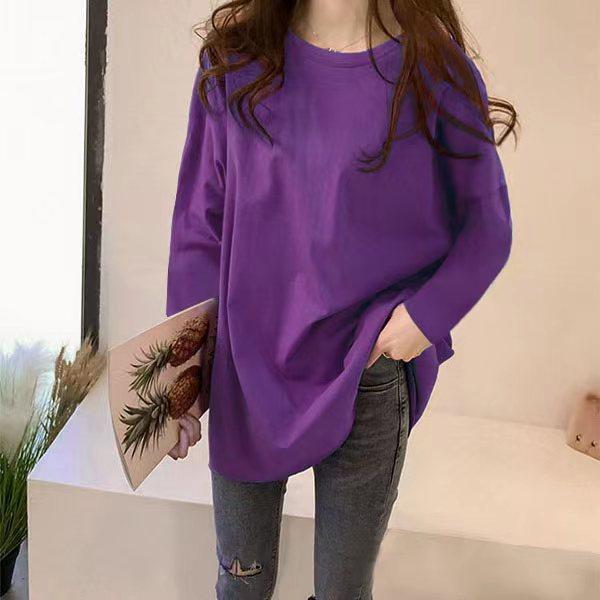 韩版春秋大码女装胖mm中长款宽松纯色长袖T恤纯棉黑色显瘦打底衫