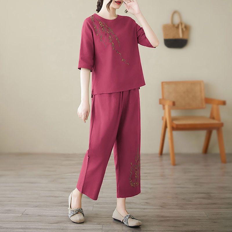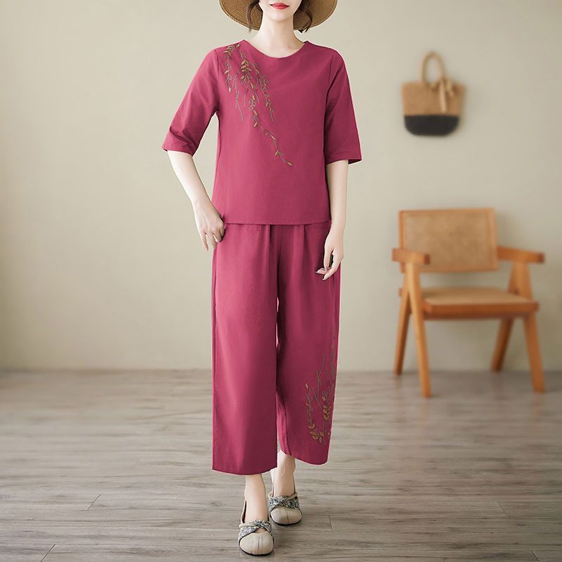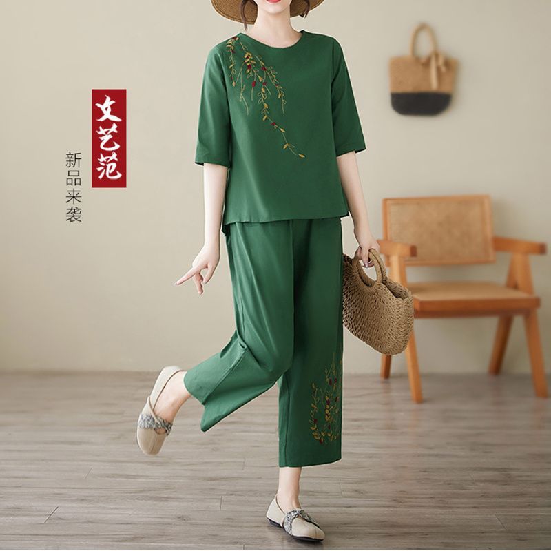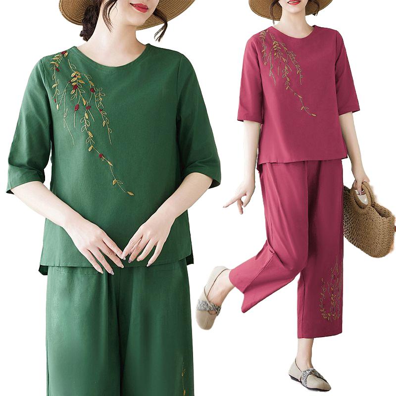 棉麻短袖套装女新款宽松外穿休闲时尚妈妈夏季刺绣两件套九分裤子