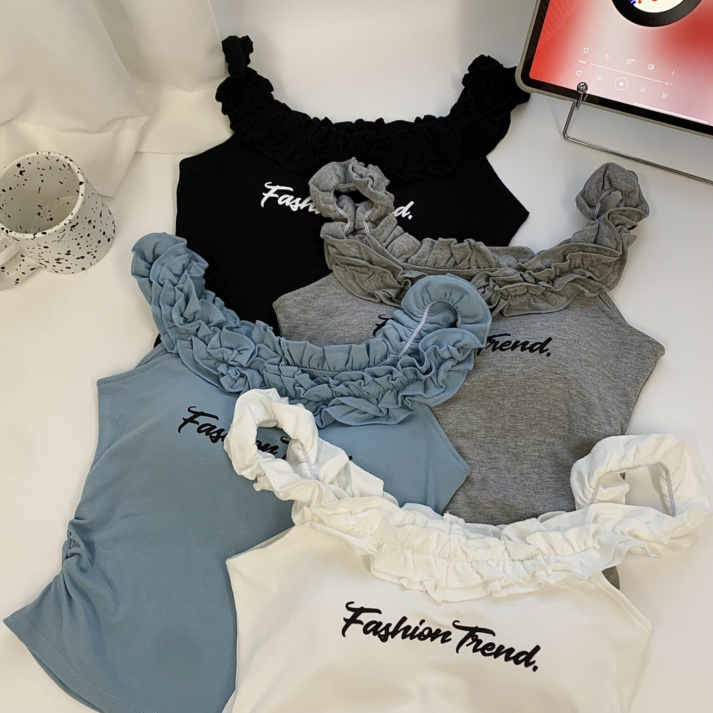 性感纯欲风一字肩木耳边白色T恤女夏季修身显瘦别致短款露脐上衣