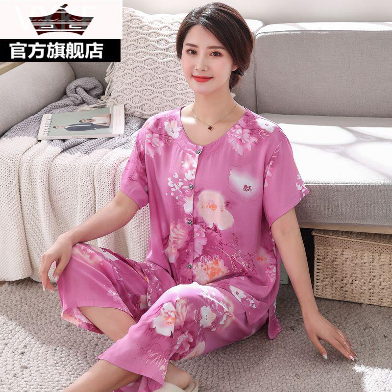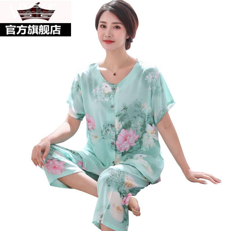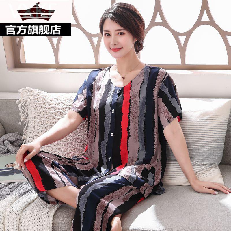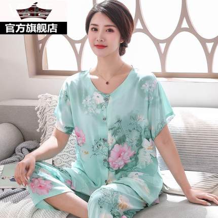 夏季中老年开衫绵绸短袖睡衣加大码妈妈装女士棉绸套装薄款家居服