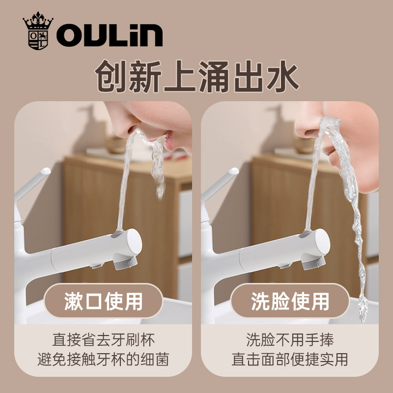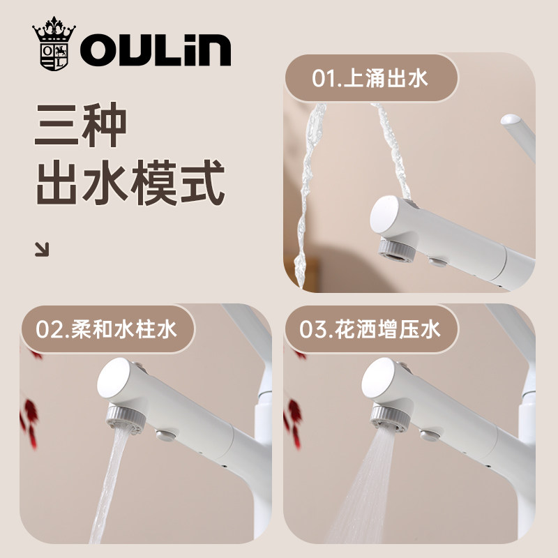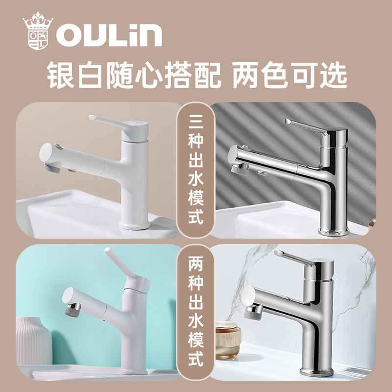 欧琳白色奶油风抽拉式面盆龙头冷热洗脸盆三出水龙头
