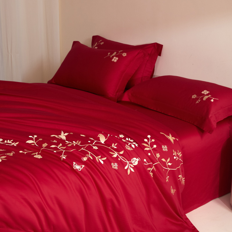 高端全棉婚庆四件套大红色绣花被套床单婚房纯棉喜庆结婚床上用品