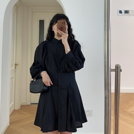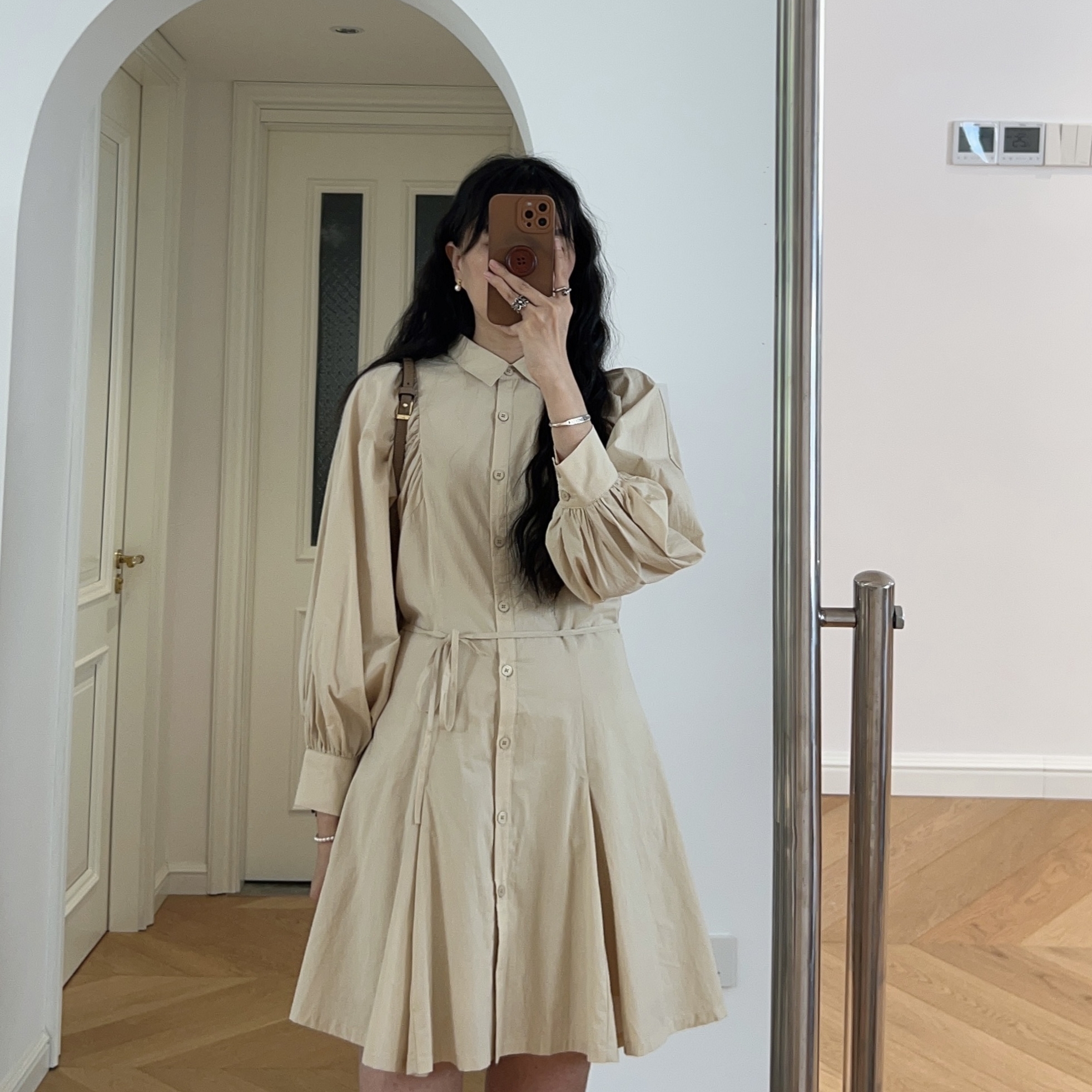 秋装新款 日系灯笼袖长袖收腰连衣裙翻领衬衫裙中长裙 0.32KG