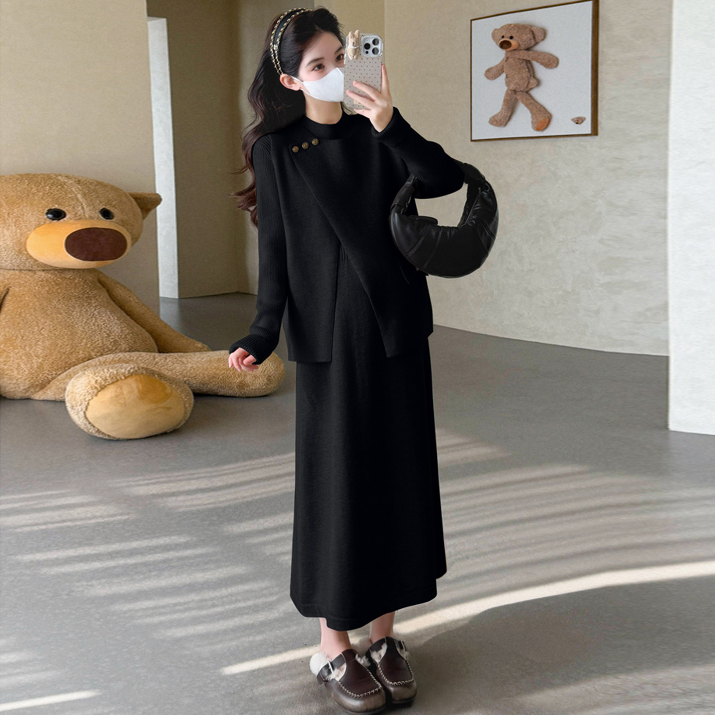 孕妇时尚连衣裙套装秋冬季新款高级感孕妇装针织打底衫马甲两件套