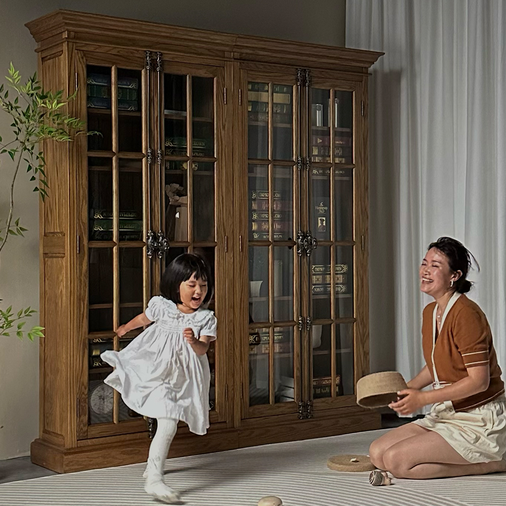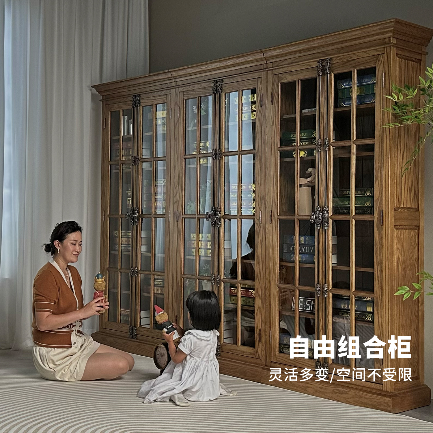 美式复古实木橡木玻璃门书柜