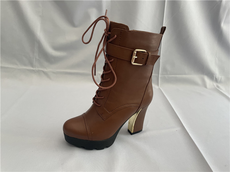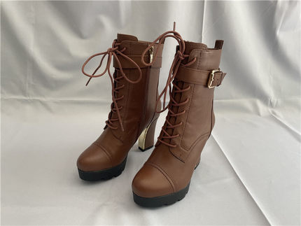 商场清仓女鞋真皮方头高跟马丁靴女系带秋冬瘦瘦靴皮带扣百搭粗跟