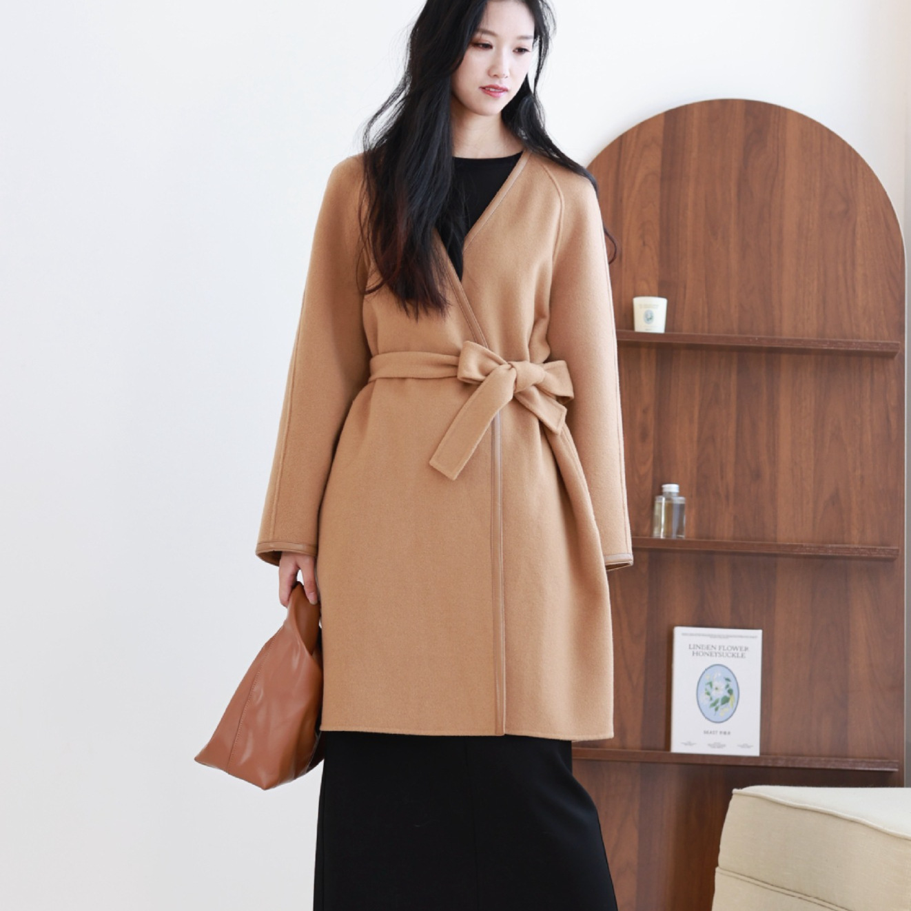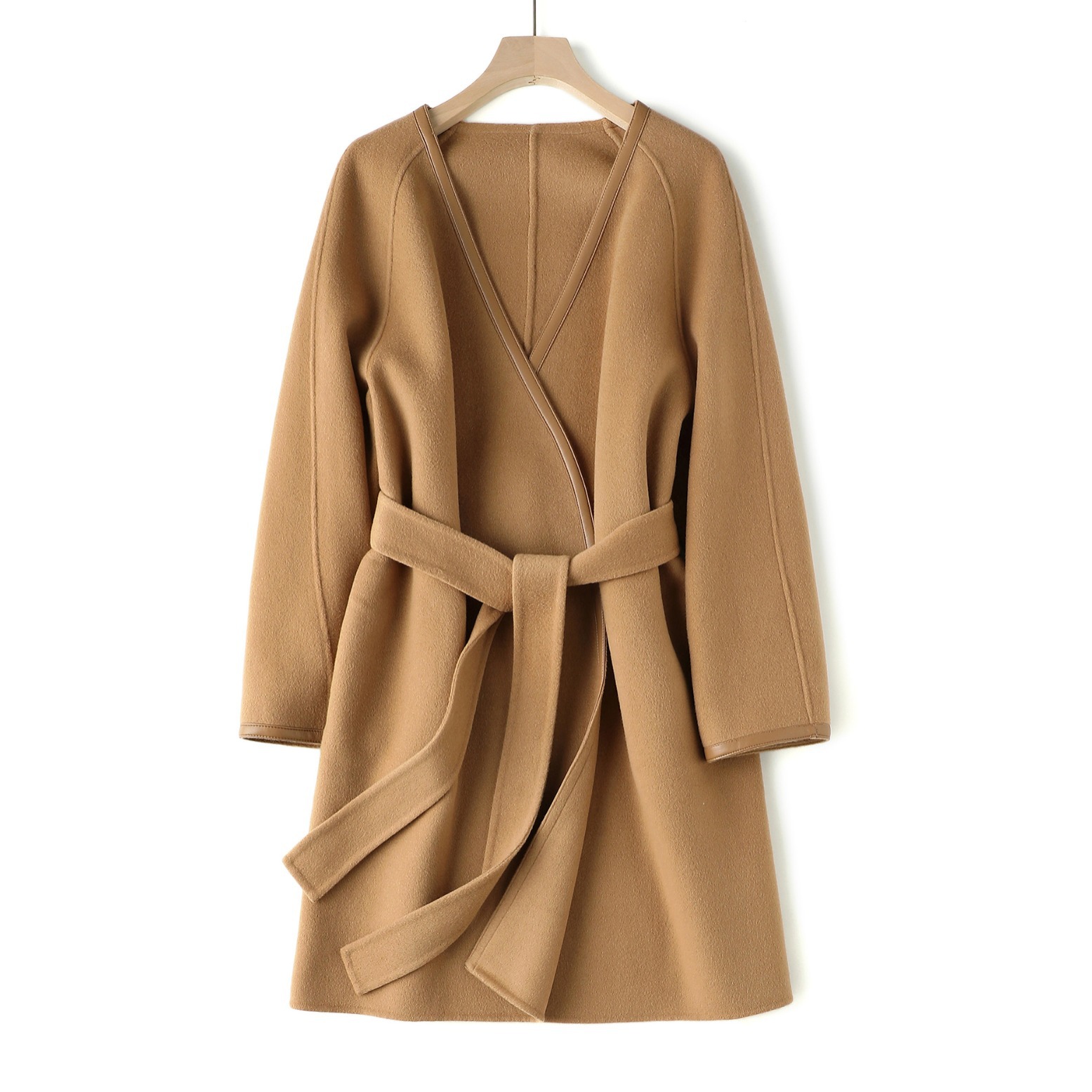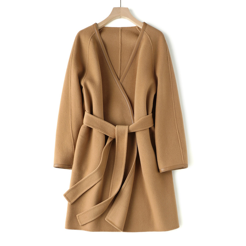 拼皮羊绒中长款系带双面呢大衣