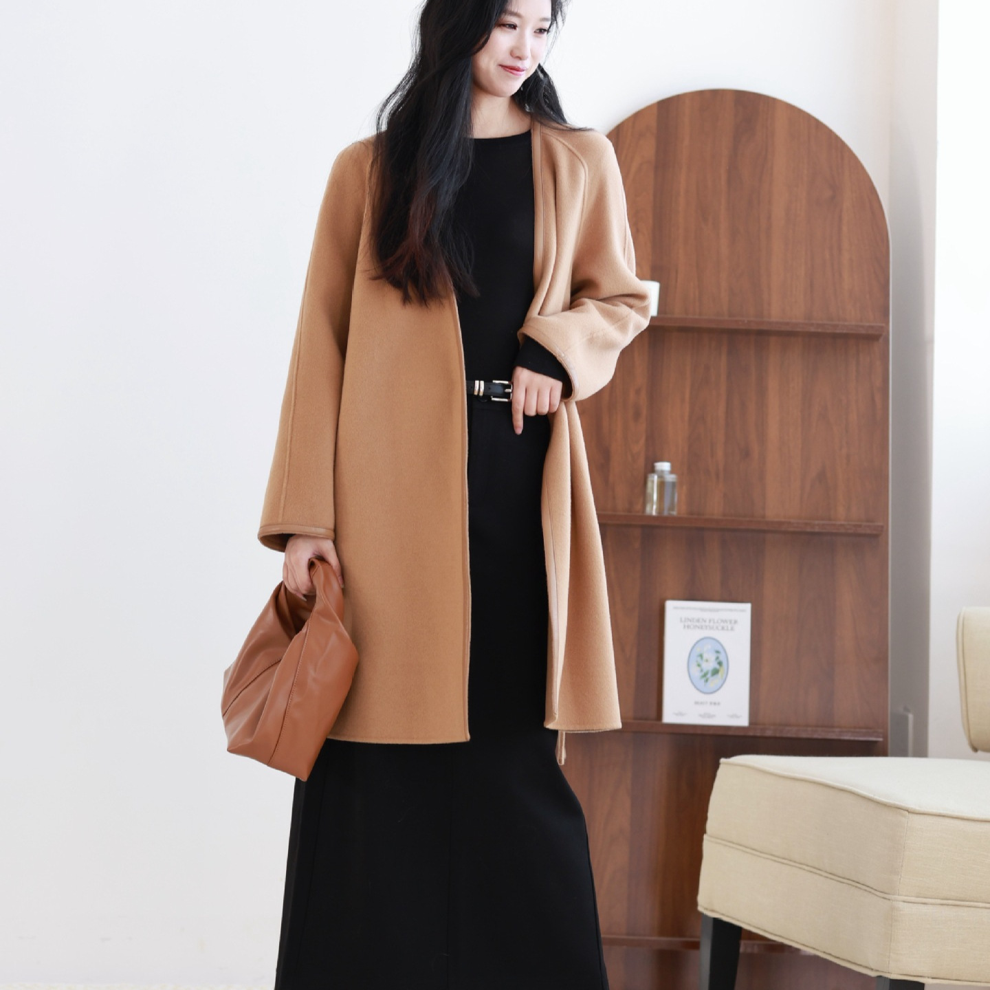 重工拼皮高支小羊绒无领双面呢大衣知性系带中长款外套利落雅致女