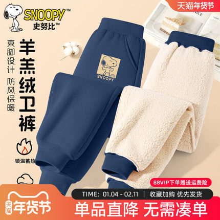 史努比男童加绒加厚裤子冬2026新款保暖羊羔绒棉裤儿童一条过冬裤