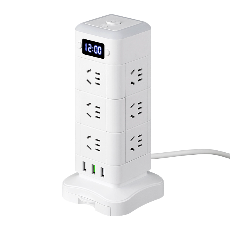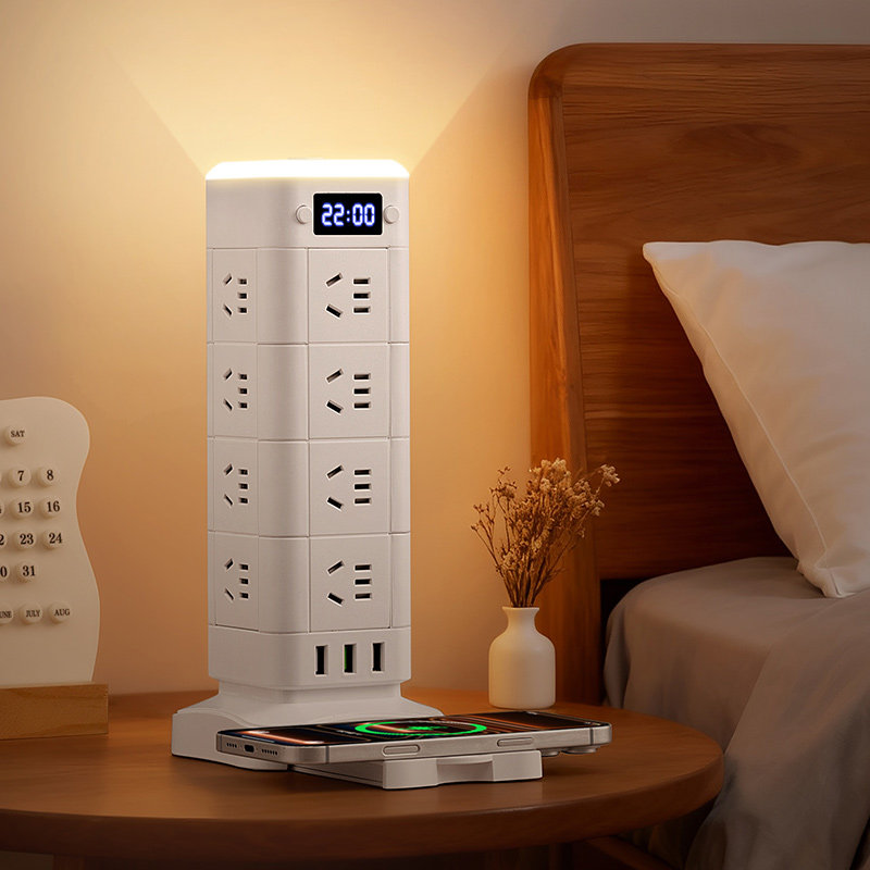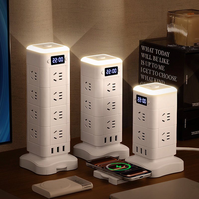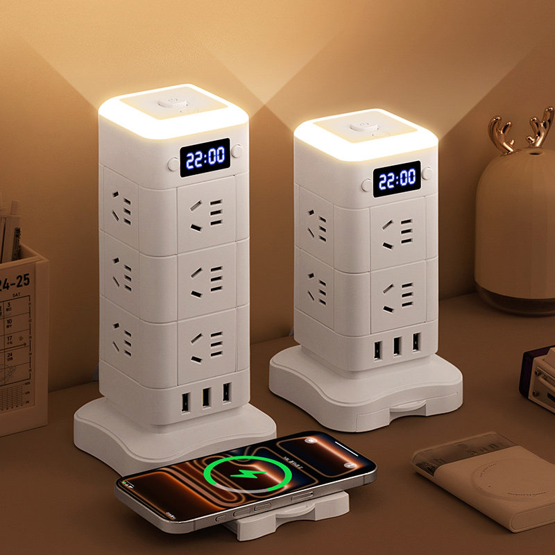 正品公正午立式魔方插座带USB夜灯时钟无线充电接线板一转多插排