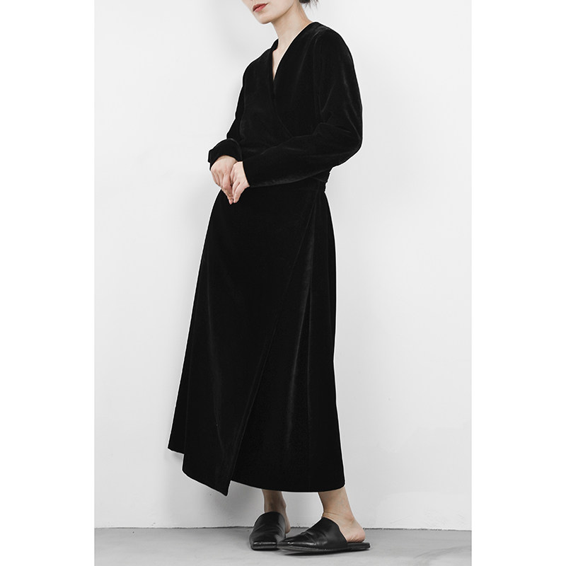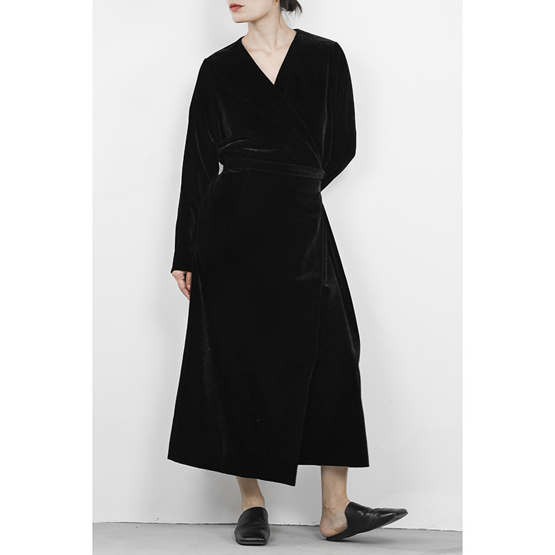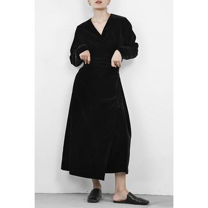 JUZININE原创设计 真丝绒系带连衣裙 长袖收腰长裙