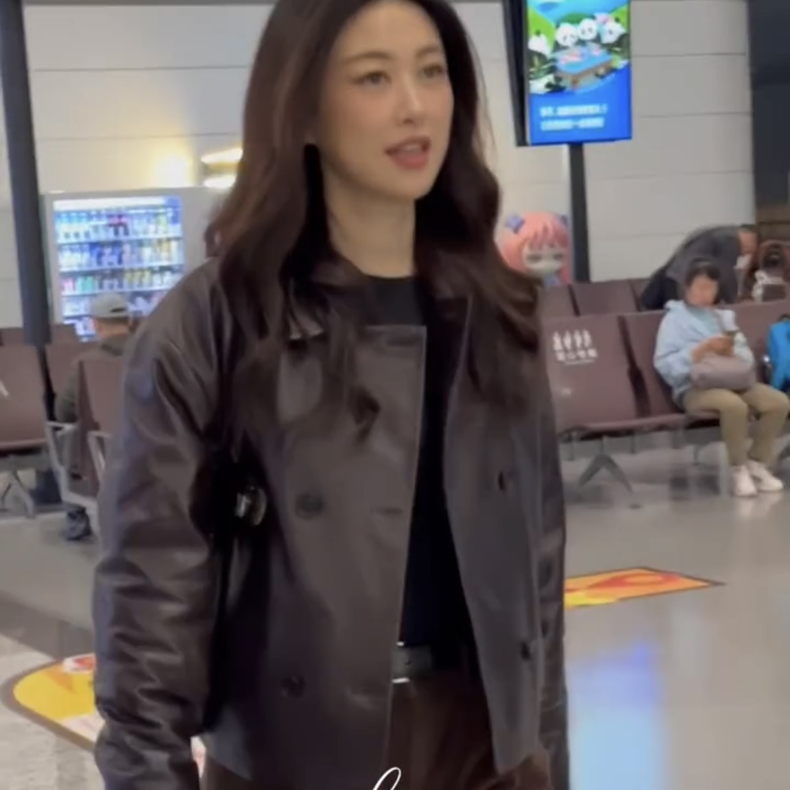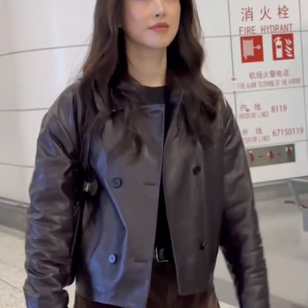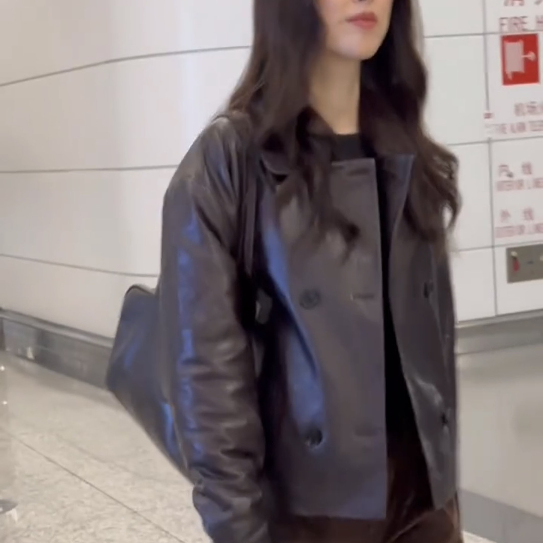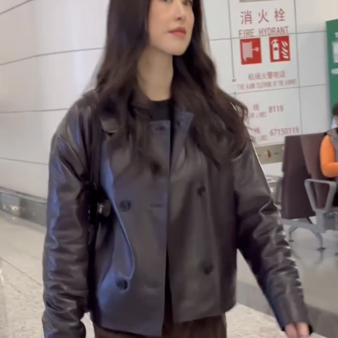 明星同款春季新品朱珠气质深棕色双排扣短款皮衣夹克外套女